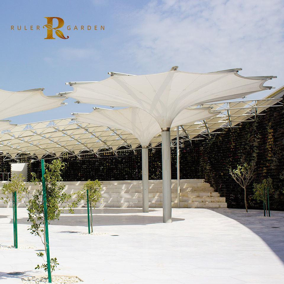 Passerelles préfabriquées structures automatiques à membrane en PVC durable structures d'abri soleil pliantes électriques extérieures tulipe parapluie