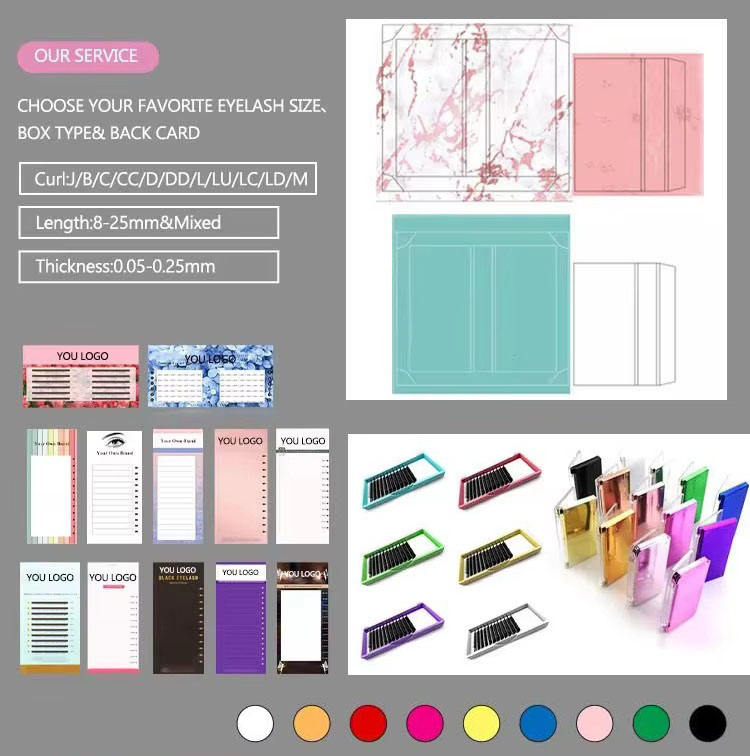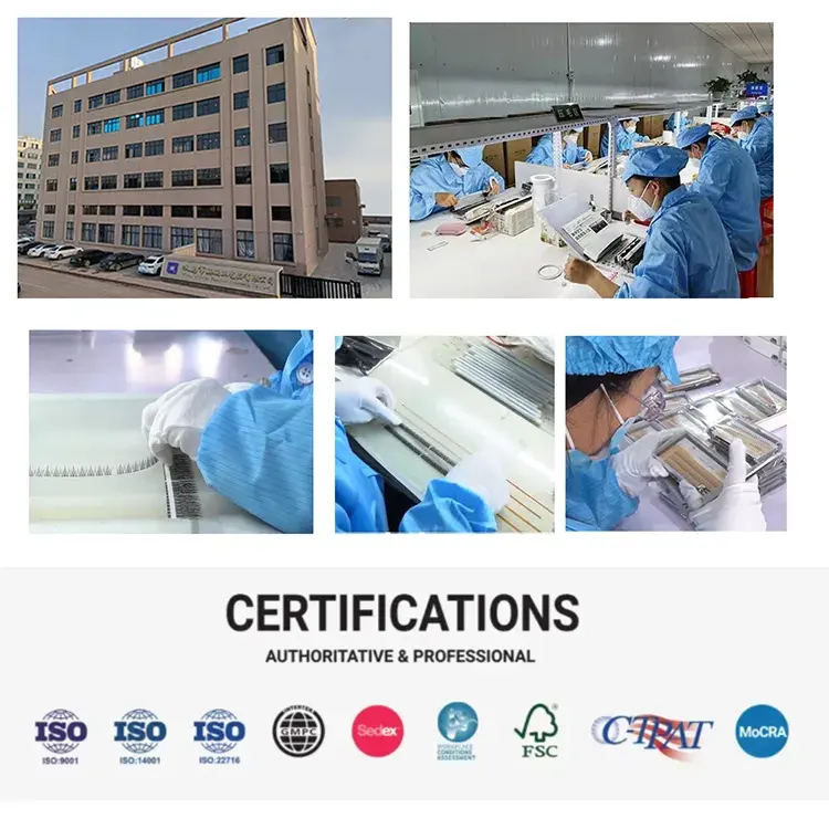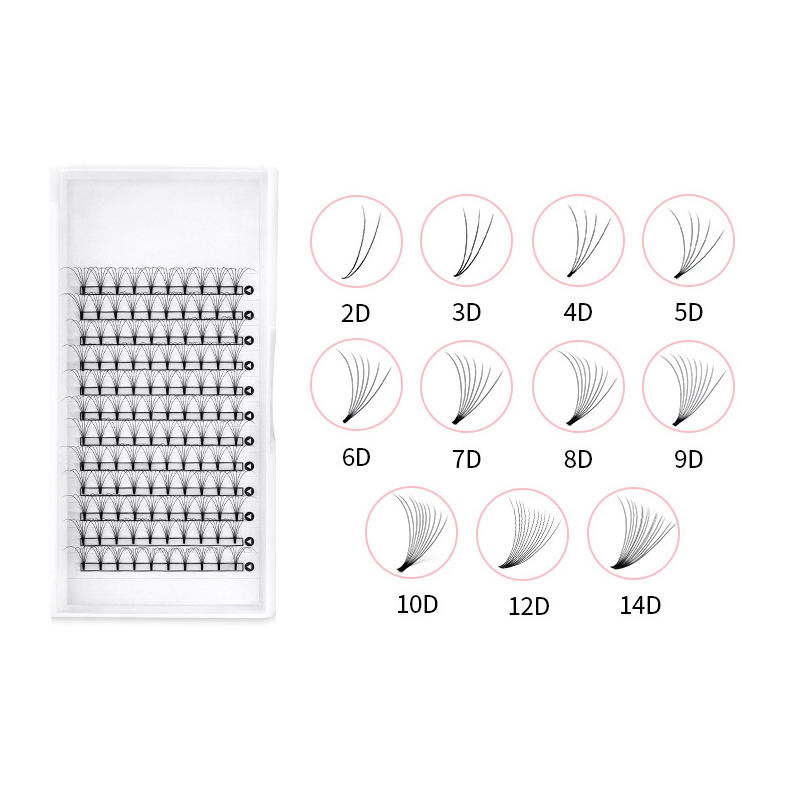 Extensions de cils prémontées 2D–10D, tige courte, PBT coréen 0,05/0,07/0,10 mm, longueurs 8–15 mm, noir, 12 lignes/boîte