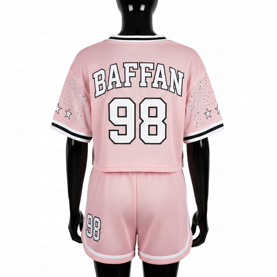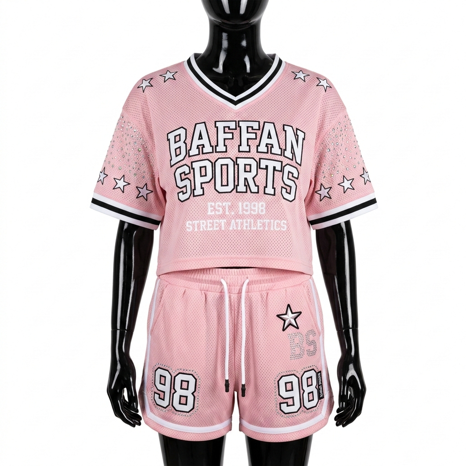 Ensemble court en maille polyester respirante 150 GSM de qualité supérieure, rose, vêtements de sport, col à rayures côtelées, logo personnalisé par sublimation, ensembles pour femmes