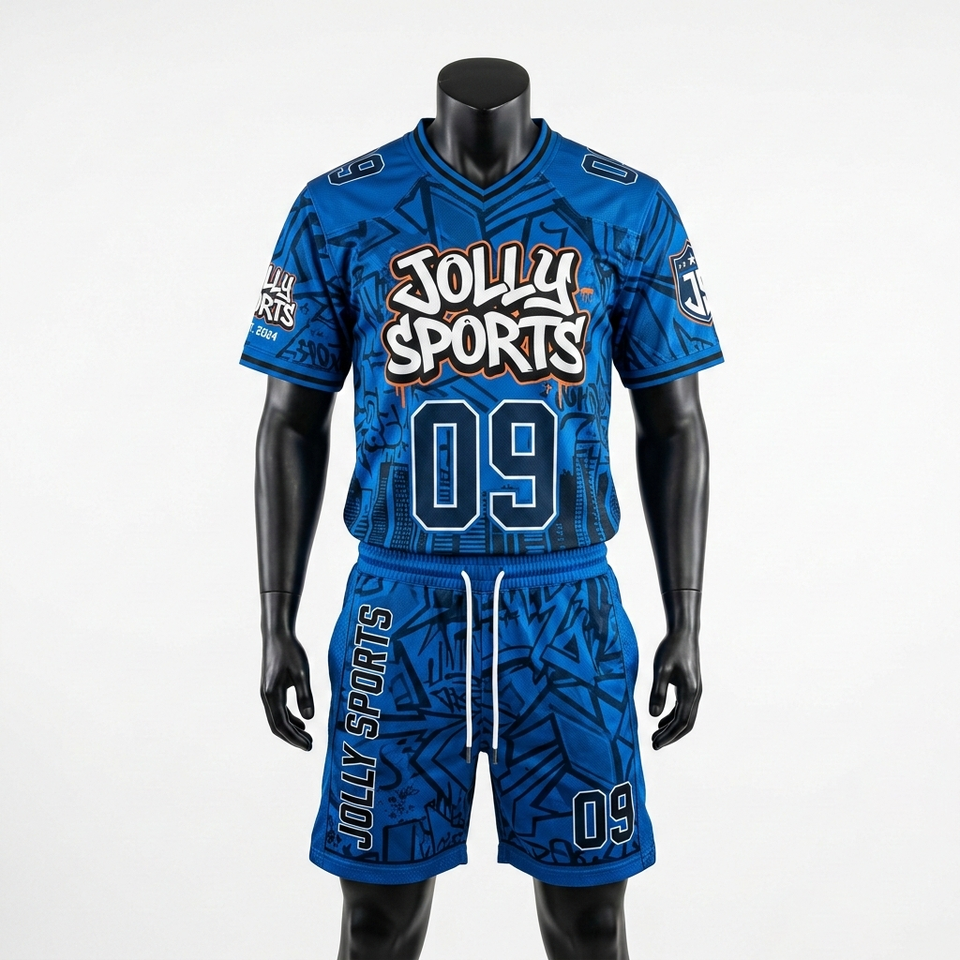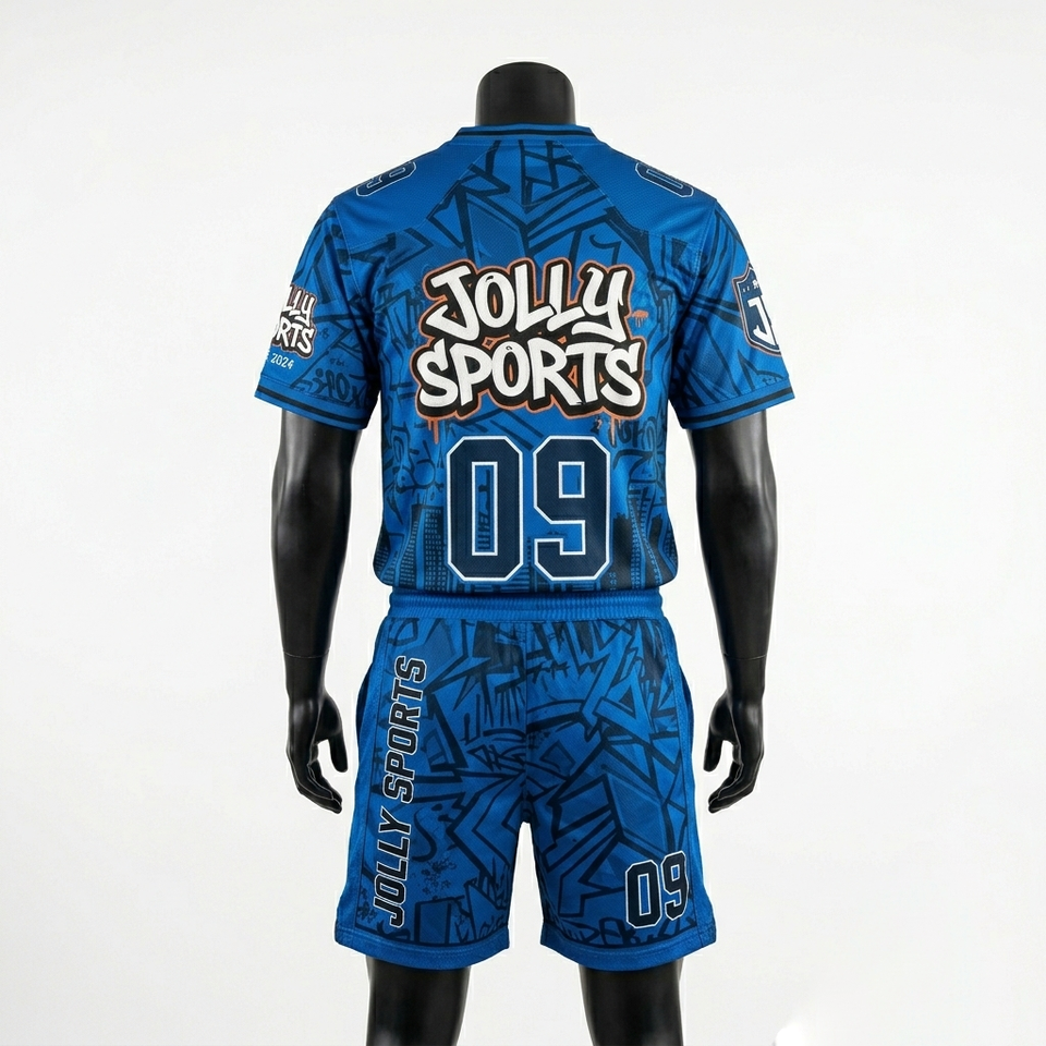 Ensemble maillot et short de football en polyester interlock premium 180 GSM, bleu, panneaux sublimés, logo personnalisé, pour homme