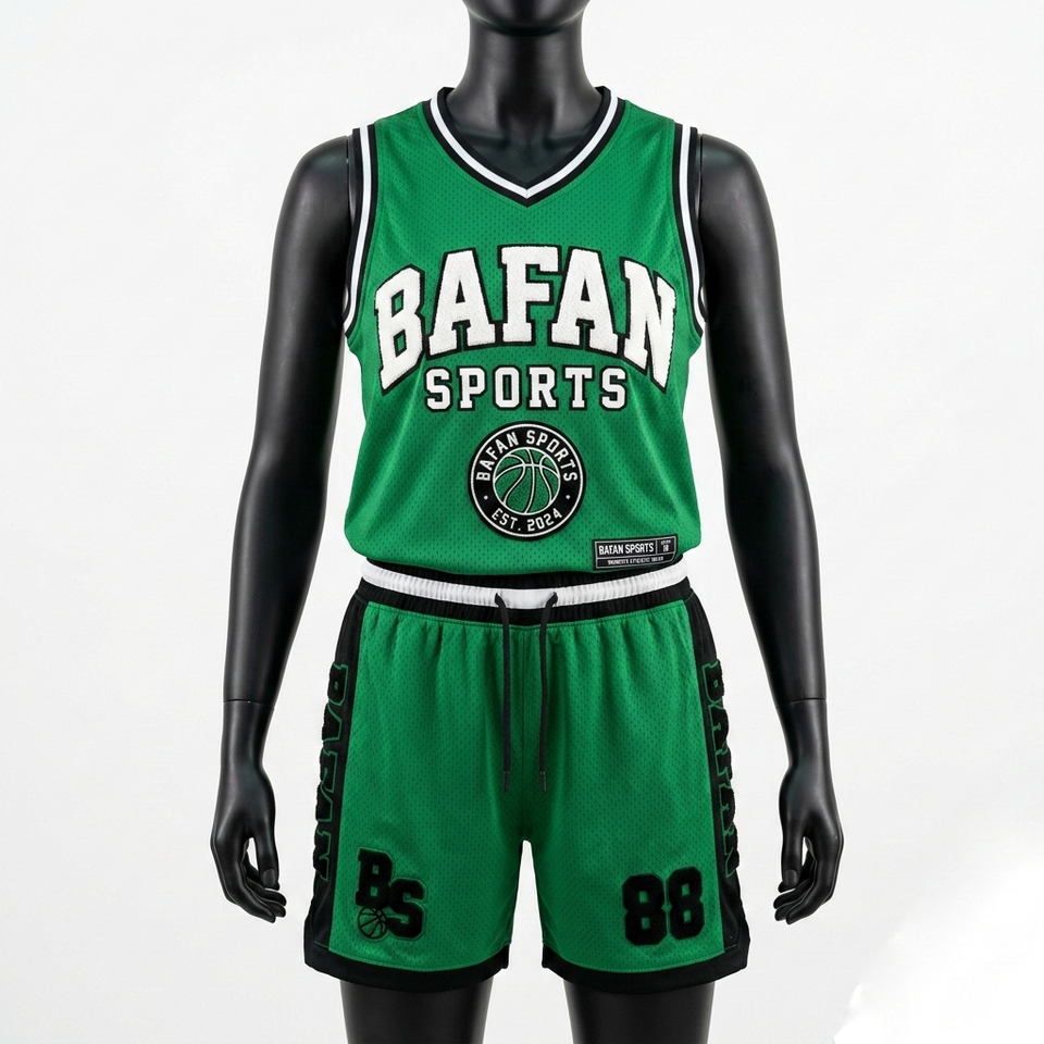 Ensemble maillot et short de basketball en polyester mesh premium 190 GSM, vert avec empiècements noirs, logo brodé personnalisé, pour femmes