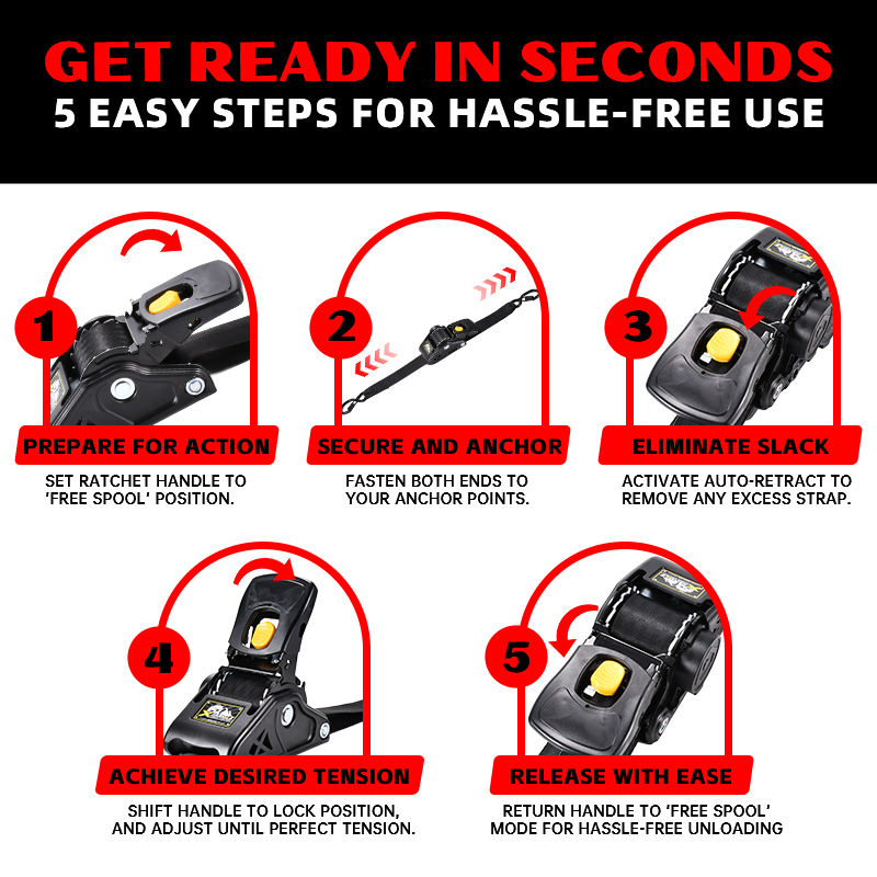 Premium 2" X 10ft 3000 Lbs. Sangle d'arrimage à cliquet auto-rétractable robuste BS, sangles à cliquet rétractables automatiques