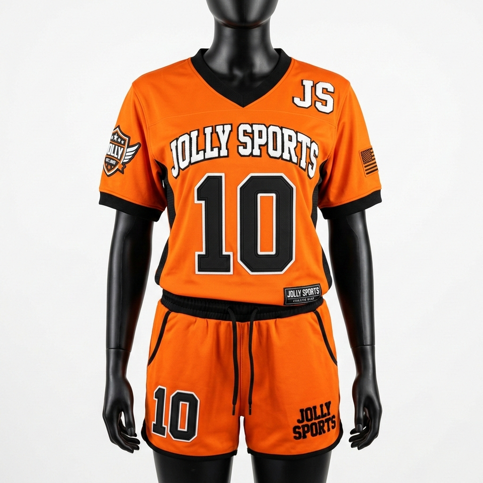 Ensemble maillot et short de football en polyester mesh premium 200 GSM, orange et noir, impression personnalisée, pour femmes