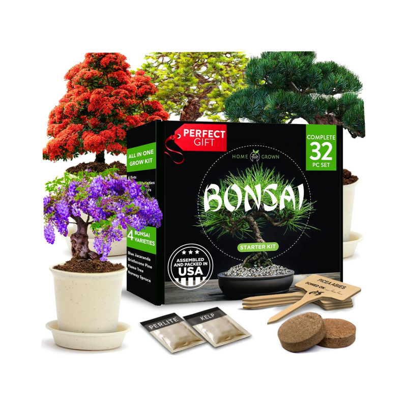 Premium 4 Bonsai Arbres Starter Kit Jardinage Plante Cadeau pour Usage Domestique pour Débutants et Jardiniers Comprend Fleur Artificielle