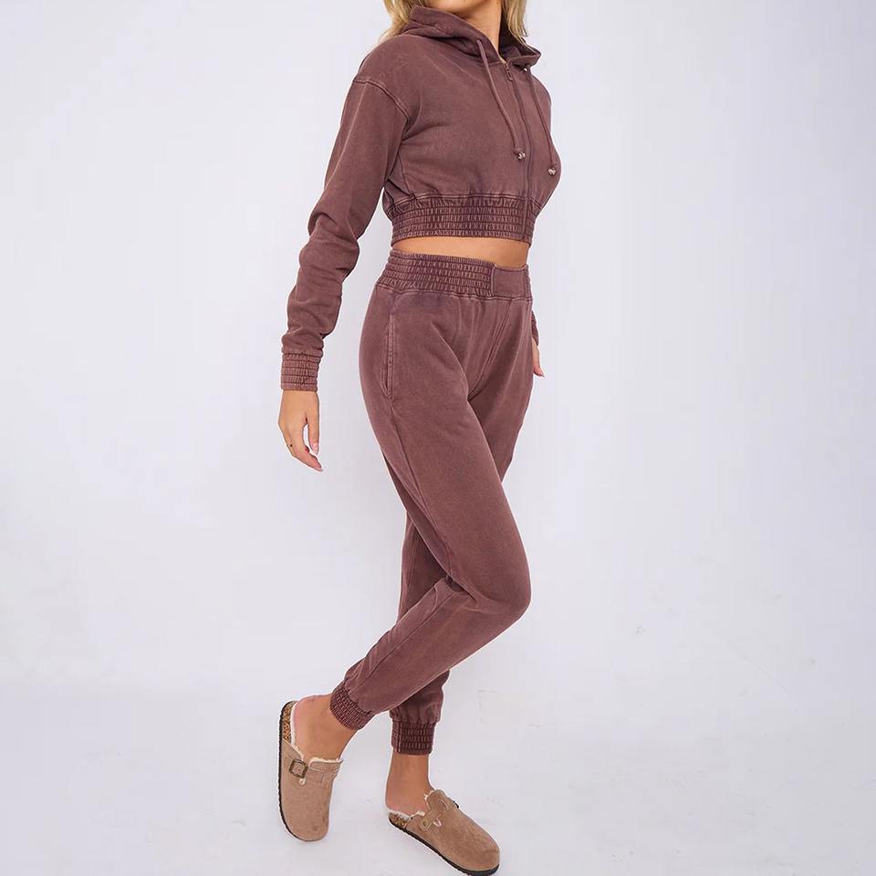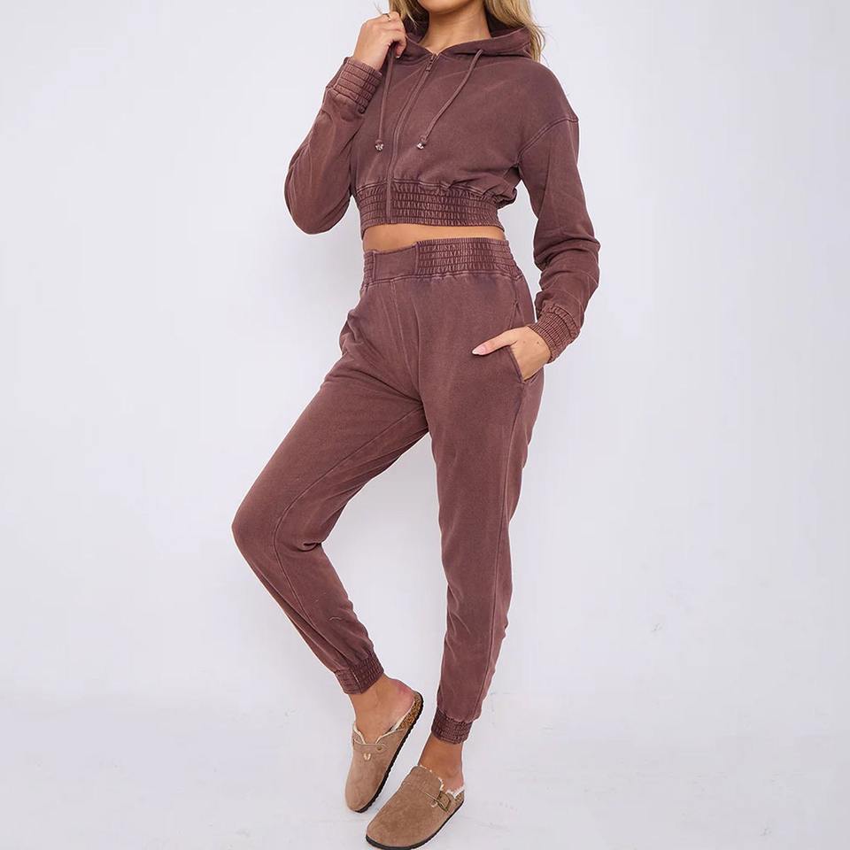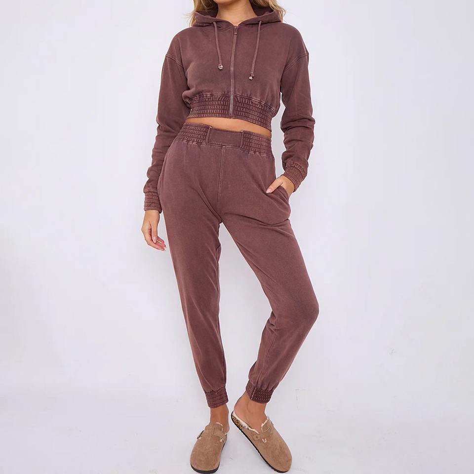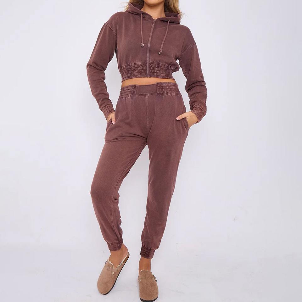 Ensemble de joggeurs délavés à l'acide de qualité supérieure pour femmes vêtements de rue personnalisés Patch broderie recadrée sweat à capuche zippé court solide Collection hiver
