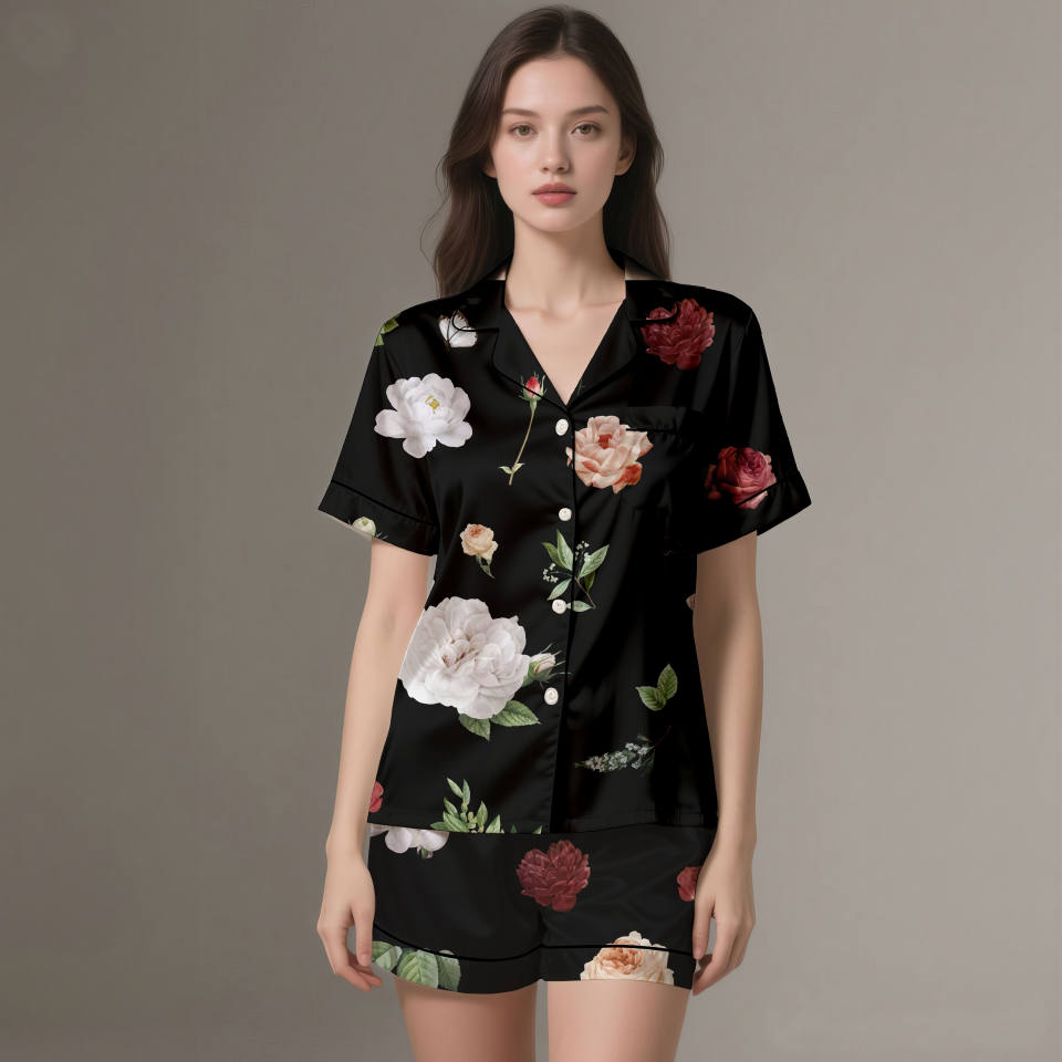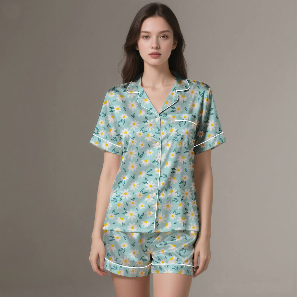 Pyjamas en satin de soie imprimés numériquement pour adultes de qualité supérieure | Vêtement de détente d'été léger et respirant en 2 pièces avec taille élastique