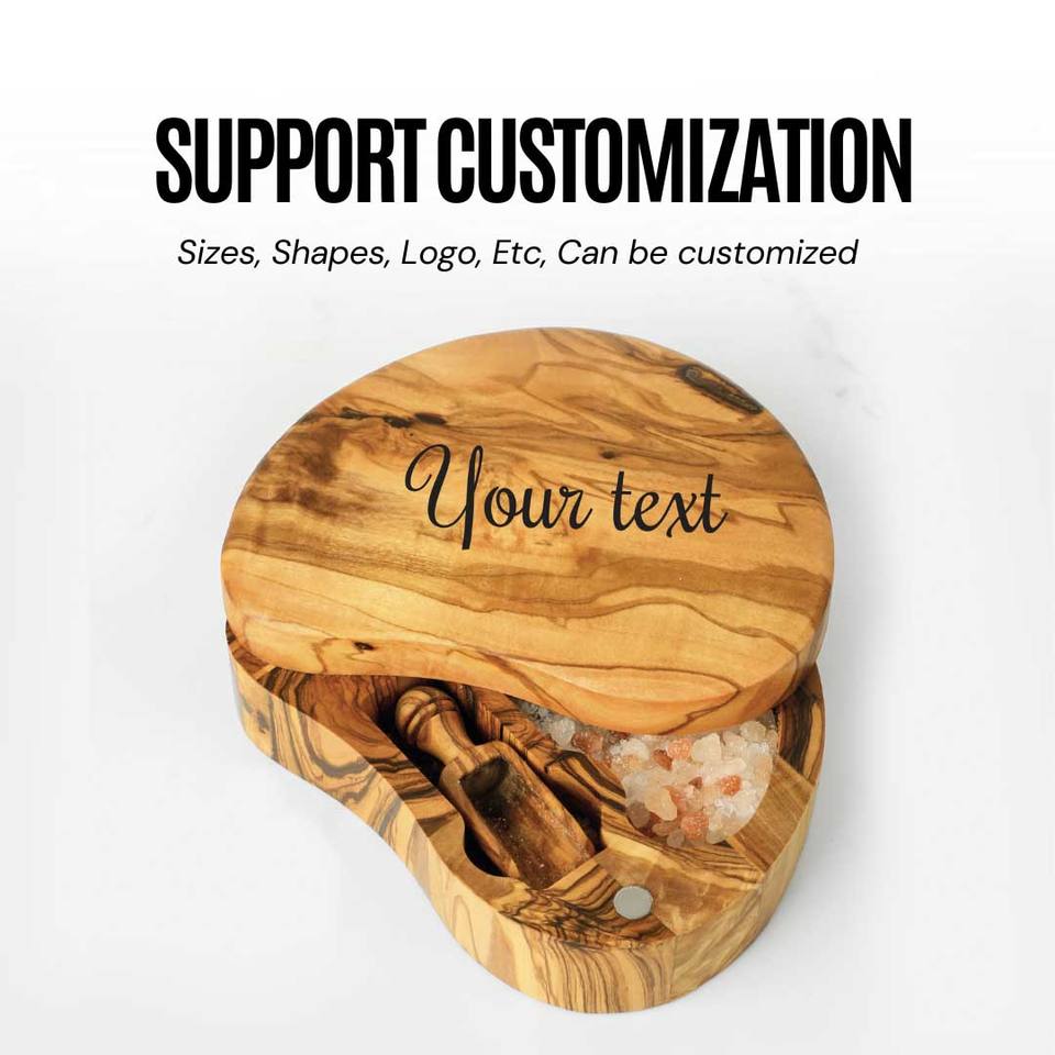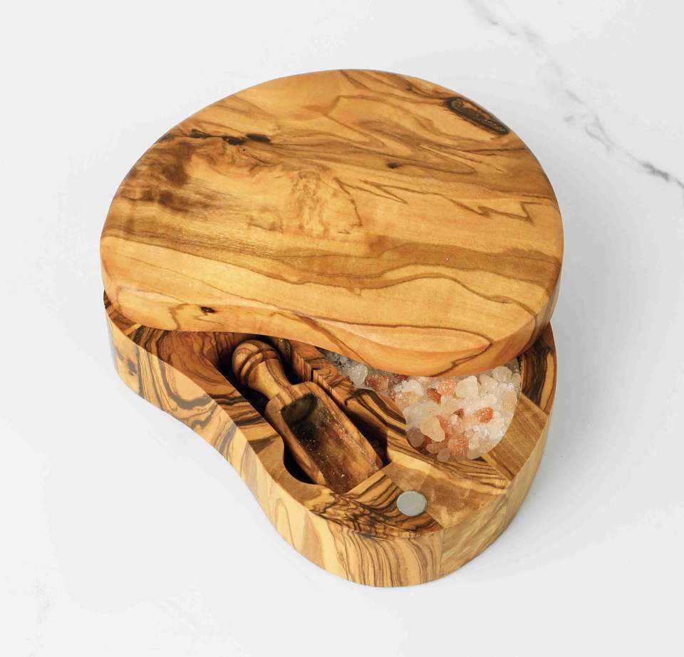 Premium ArtisRaw Rustic Vintage Mediterranean Tunisian Olive Wood Through-Carved Salt Cellar Pivoting Lid Handmade Wooden Spoon