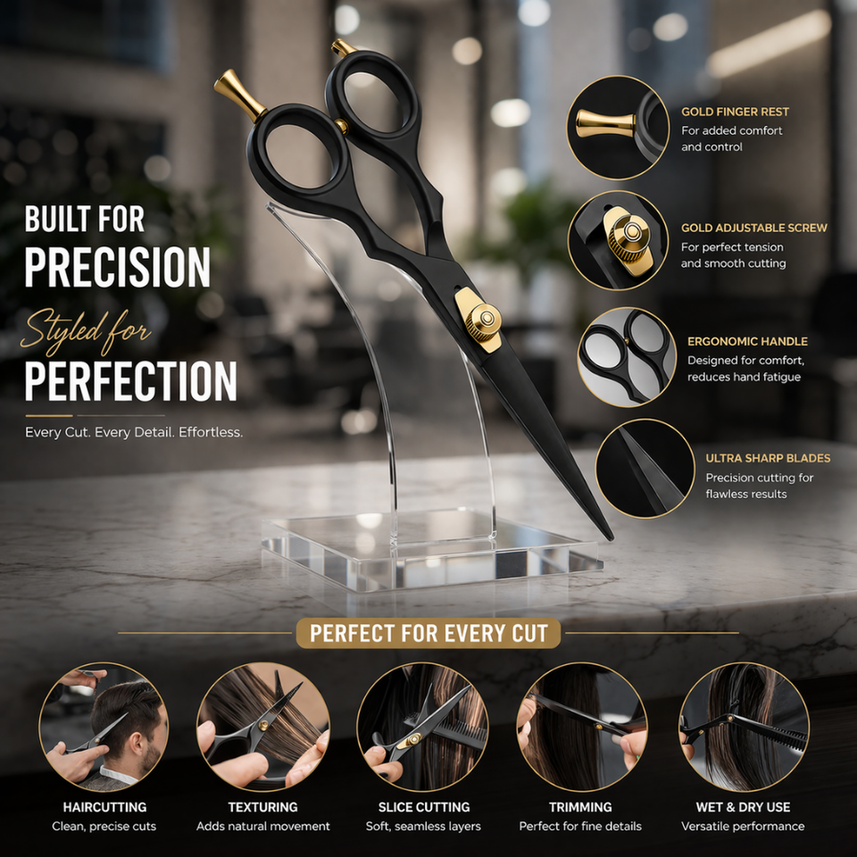 Ciseaux de barbier Premium MANAN INSTRUMENTS 6,5 pouces, noir mat, pour droitier, à bout arrondi, manche moyen, en acier inoxydable doré