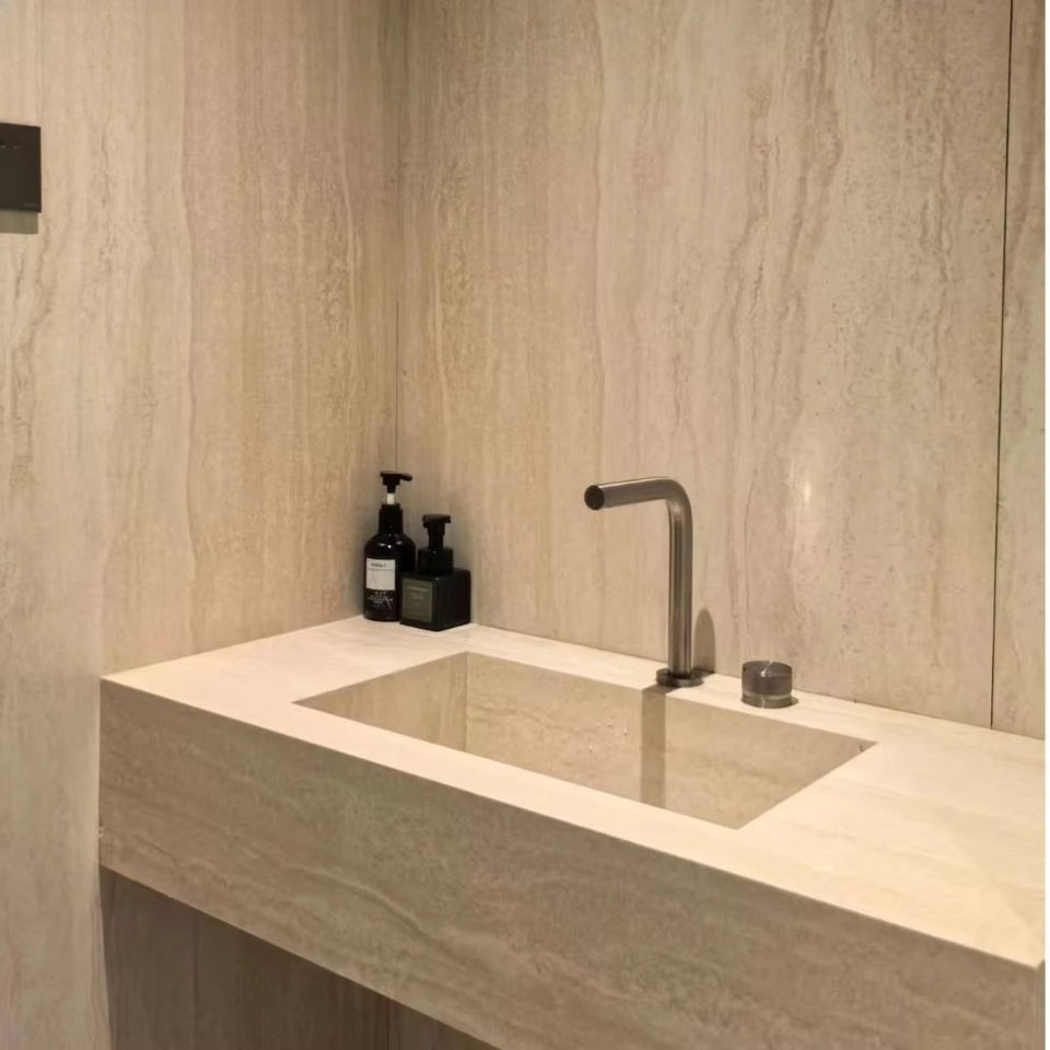 Dalles de marbre travertin beige de qualité supérieure pour îlot de cuisine, comptoir de salon, table basse de luxe personnalisable en pierre