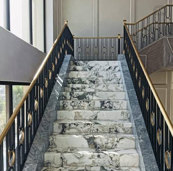 Rampe en fer forgé noir et or de qualité supérieure avec balustres ronds en laiton et main courante en laiton pour la conception d'escaliers de luxe pour maisons et hôtels