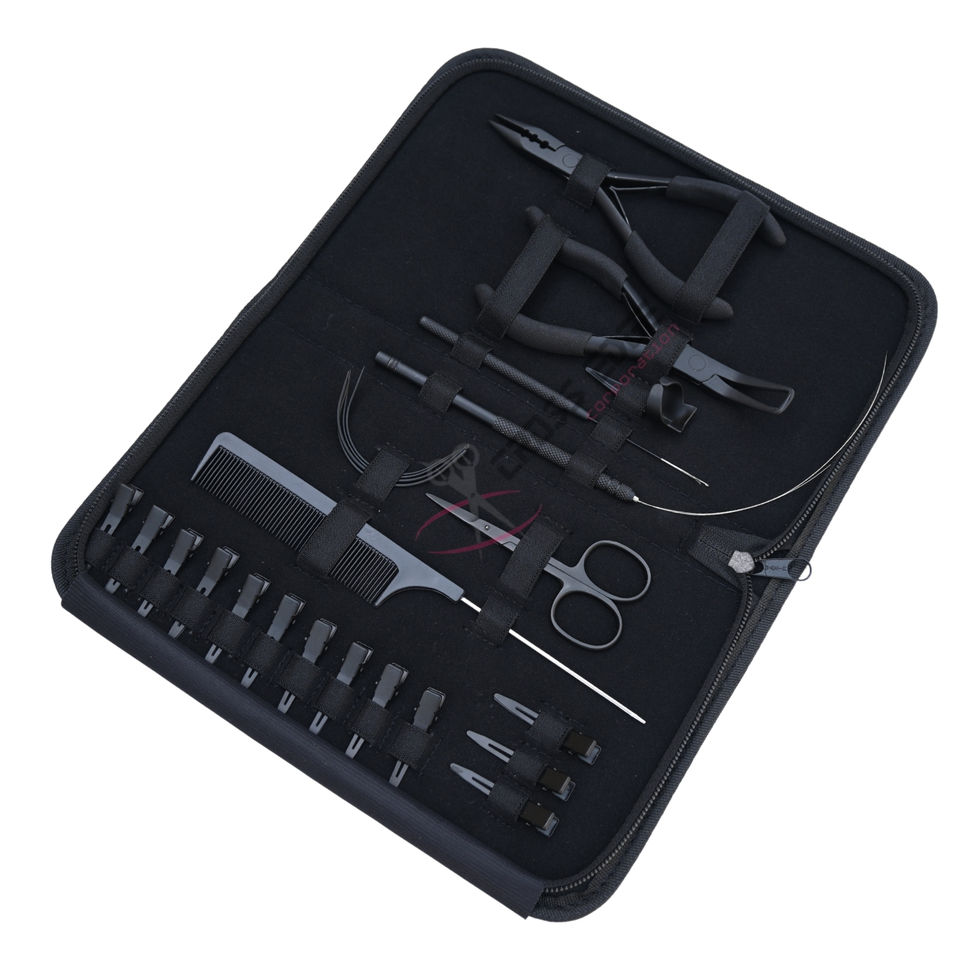 Kit de Coiffure Professionnel Premium pour Extensions de Cheveux Noirs avec Pince à Micro-Anneaux, Pince à Sertir, Ciseaux à Fil, Pince de Coiffage et Doigtier à Séparer les Cheveux
