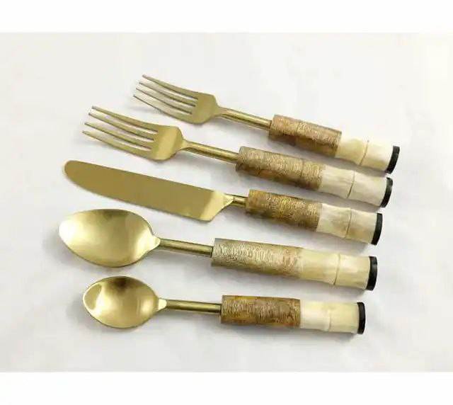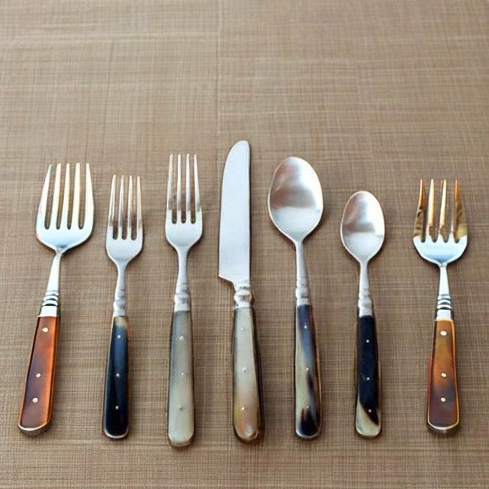 Ensemble d'ustensiles de table vintage en acier inoxydable avec manche en os, comprenant cuillère, fourchette et couteau, idéal pour les fêtes