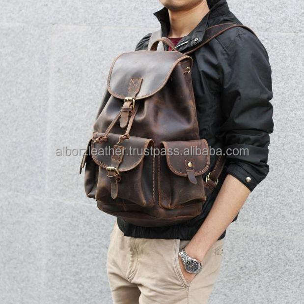 Sac à dos à cordon en cuir vintage marron de qualité supérieure Sac de voyage unisexe avec logo personnalisé avec fermeture de couverture pour l'université et l'extérieur
