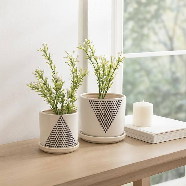 Ensemble de pots de fleurs en céramique de qualité supérieure avec un design géométrique découpé, porte-plantes décoratif d'intérieur durable avec plateau