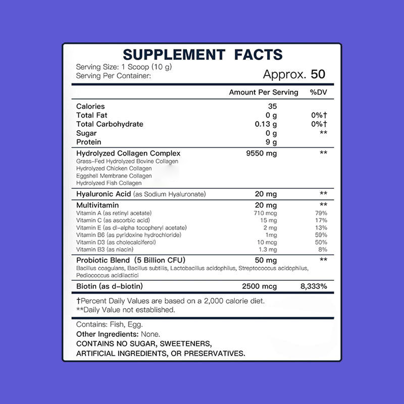 Ingrédient principal:Protéine, Complexe de collagène hydrolysé, Acide hyaluronique, Multivitamines, Mélange probiotique, Biotine