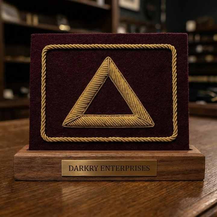 Plaque de reconnaissance personnalisée de qualité supérieure avec patch triangulaire en fil d'or maçonnique sur feutre bordeaux et bordure tressée dans un cadre en bois foncé