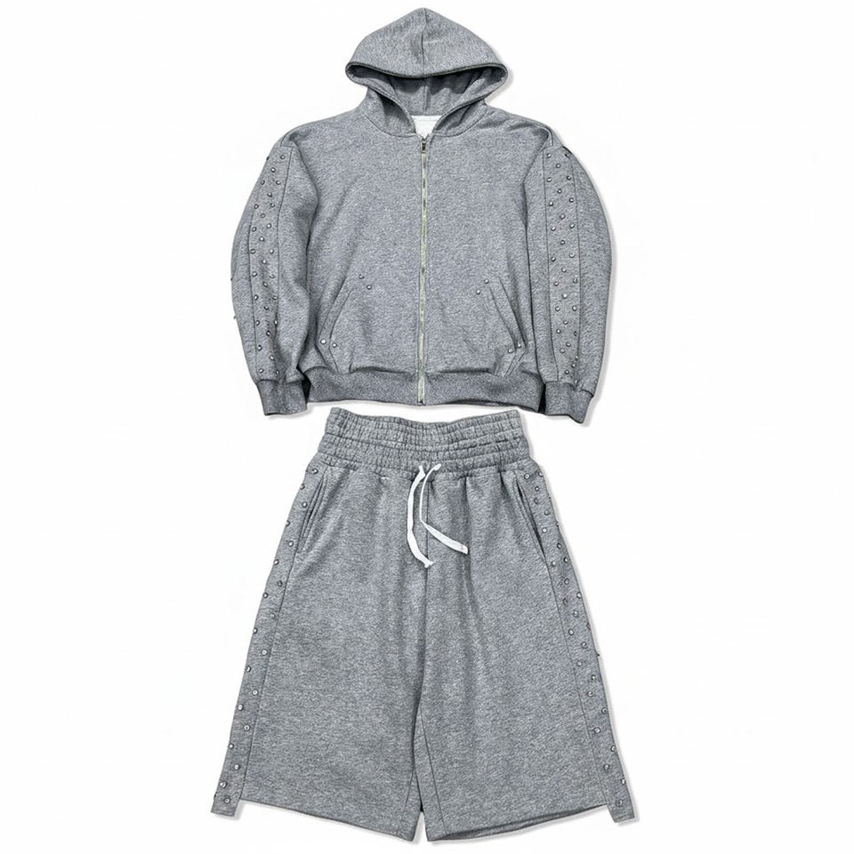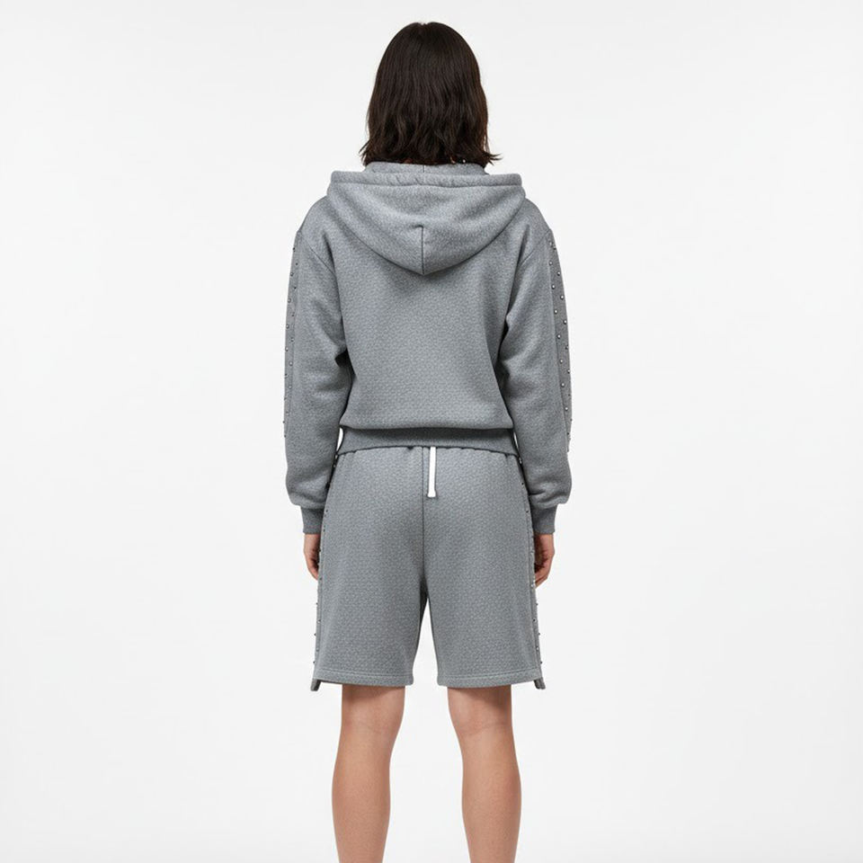 Ensemble deux pièces de luxe pour homme : sweat à capuche zippé gris clouté et short en molleton épais à séchage rapide, avec détails en strass