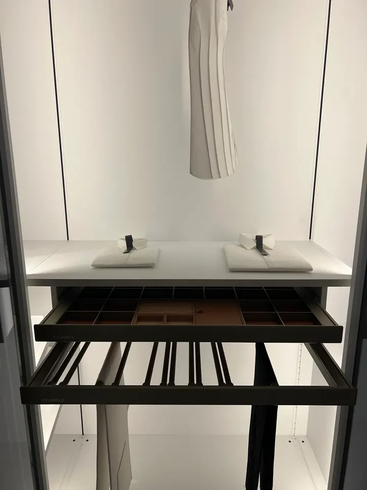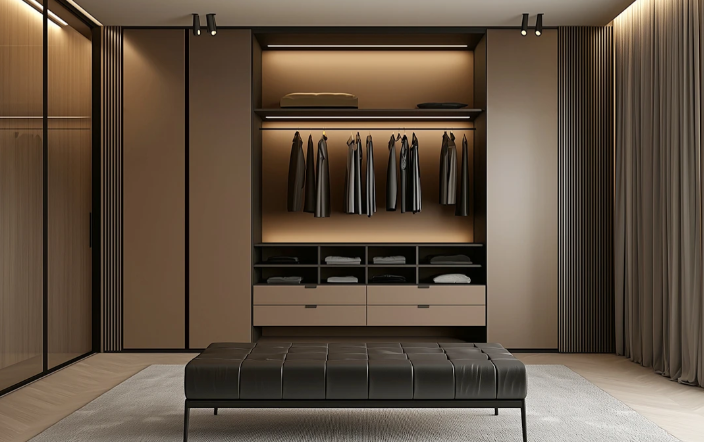 Dressing sur mesure moderne de luxe, armoire autoportante avec cloison en verre, éclairage LED, chambre à coucher, appartement, villa, maison