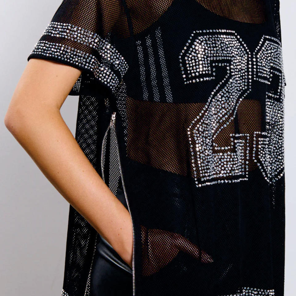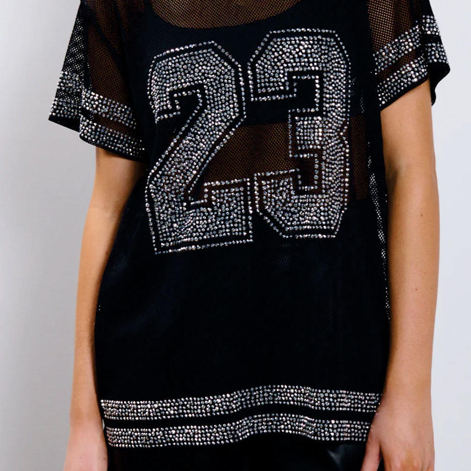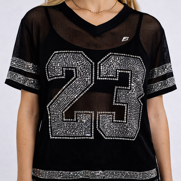 Maillot de football américain personnalisé haut de gamme pour femme, orné de strass, coupe oversize streetwear, crop top carré, maillot transparent orné de cristaux