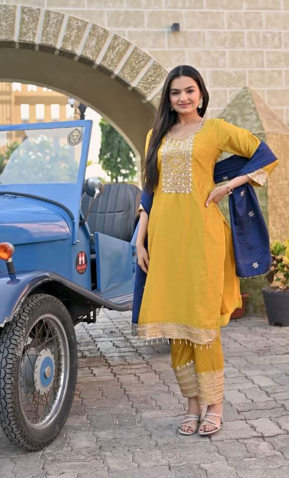 Romain Soie Avec Sequins Broderie Kurti Pant Et Dupatta