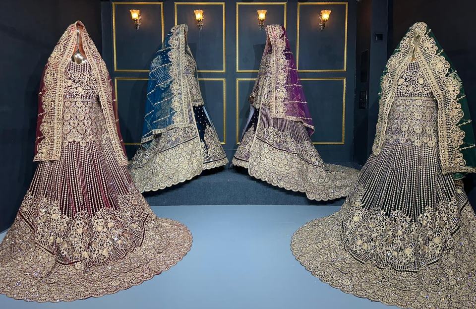 Lehenga en velours de créateur de qualité supérieure avec un travail en pierre riche taillée Heavy Trail et quatre options de couleur pour les mariages traditionnels