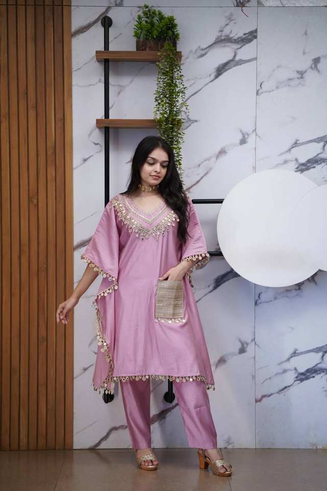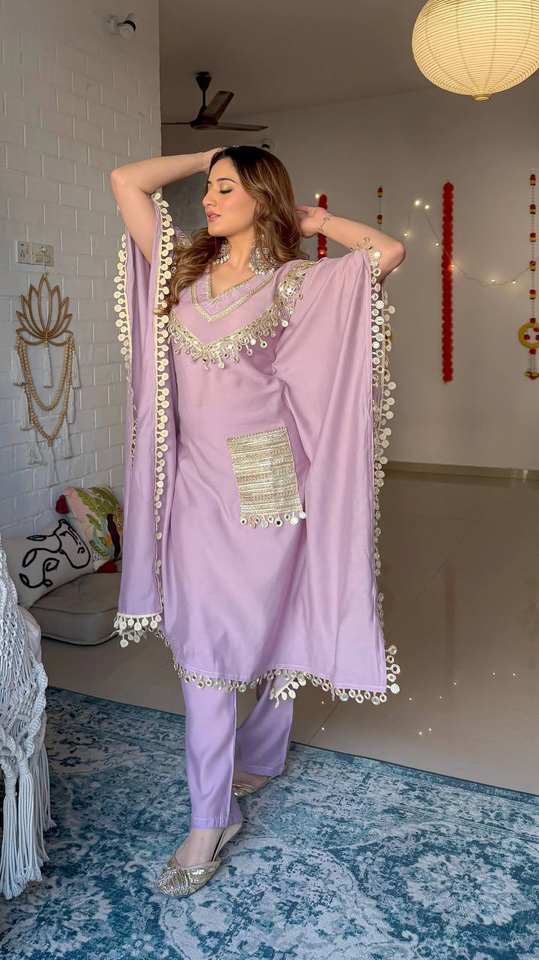 Ensemble de kaftan en satin Devsena de qualité supérieure avec travail de miroir véritable et poche en dentelle brodée