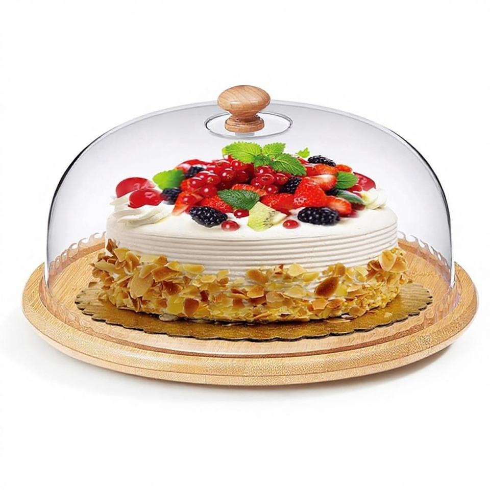 Plateau à gâteau en bois écologique de qualité supérieure, base métallique, forme lisse, surface lisse, bord décoratif, modèle utilitaire