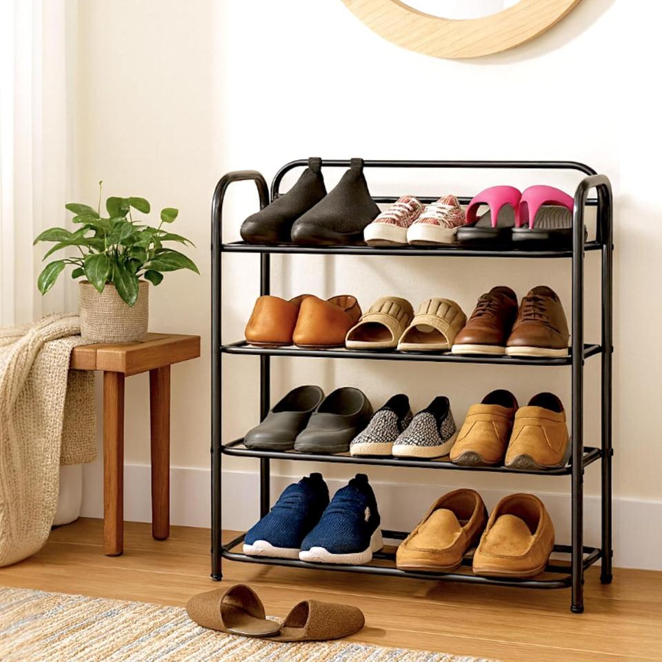 Organisateur de chaussures à quatre niveaux de qualité supérieure, grande capacité de rangement, étagères ouvertes élégantes, structure robuste, solution gain de place pour l'entrée