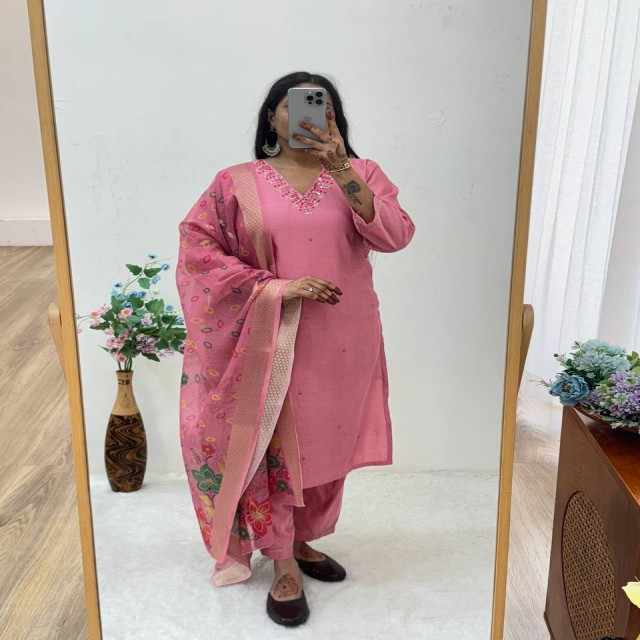 Ensemble de pantalons Premium Gadwal Soft Kurti avec col artisanal et jacquard Zari Dupatta Ethnic Collection 3 pièces