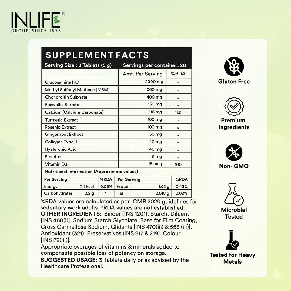 Main Ingredient:Glucosamine HCI, Vitamin D3, Ginger root Extract, Collagen Type II, Boswellia, Calcium, Hyaluronic Acid, Piperine, Turmeric, Chondroitin Sulphate, MSM