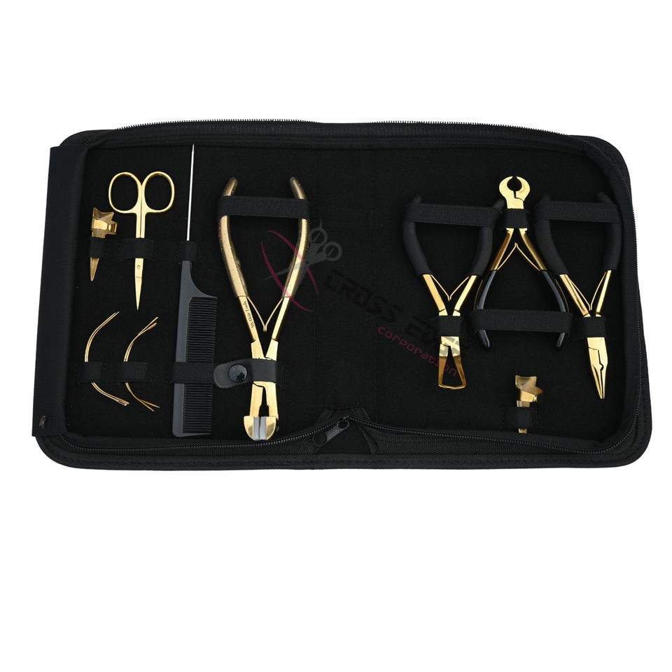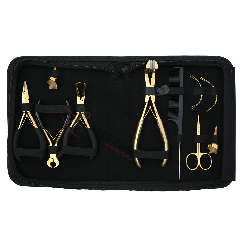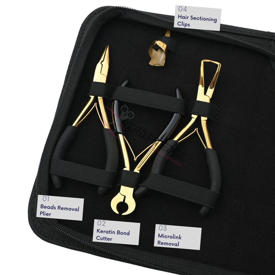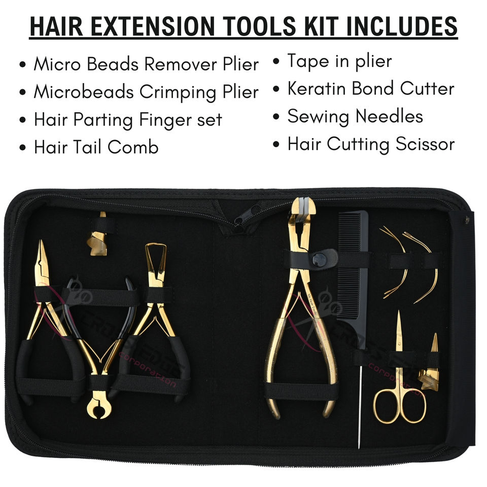 Kit d'outils premium pour extensions capillaires dorées : Pince à micro-perles, Pince à sertir les micro-perles, Pince à extensions adhésives, Coupe-limiteur de colle, Peigne à cheveux