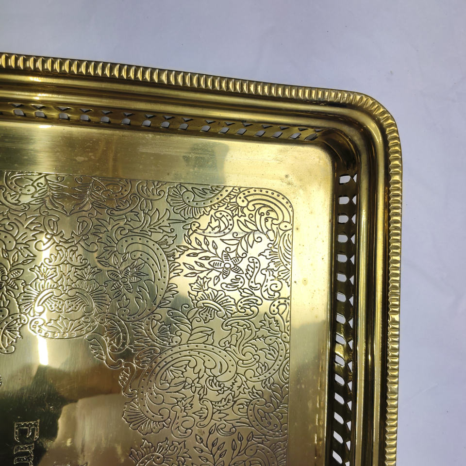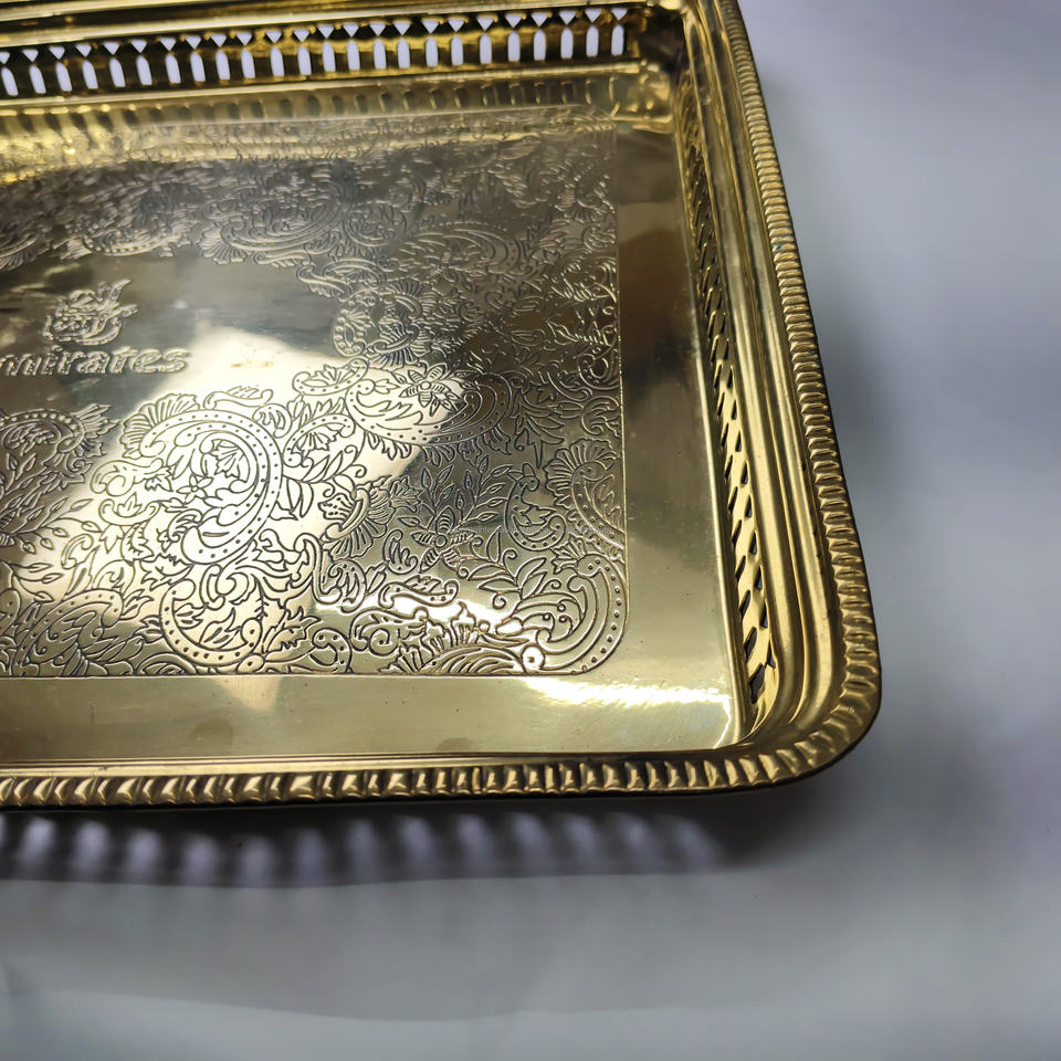 Plateau de service rectangulaire perforé plaqué or de qualité supérieure avec logo des Émirats gravé sur mesure et motif filigrané