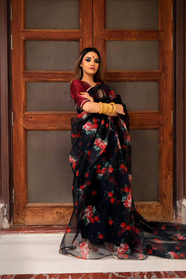 Products Name:BLACK & RED ORGANZA SAREE