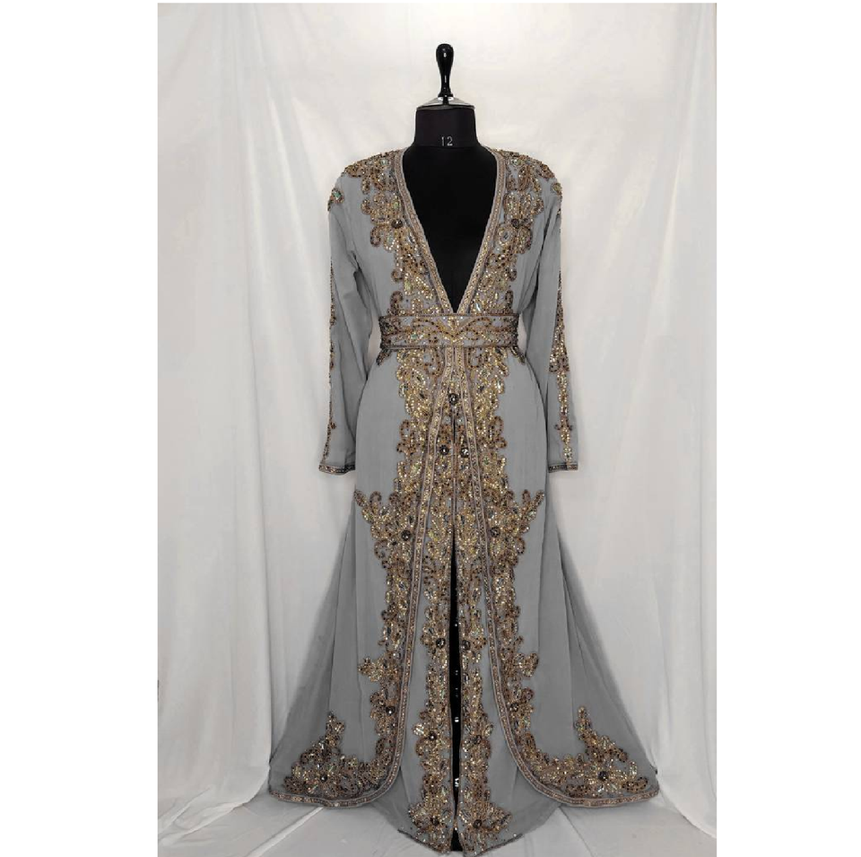 Kaftan marocain brodé à la main de qualité supérieure en georgette gris à manches longues col en V Abaya Robe islamique pour femmes et occasions