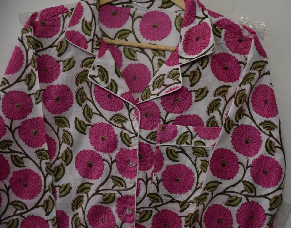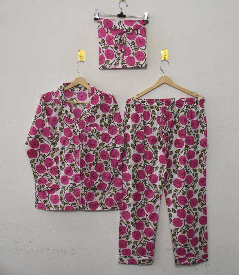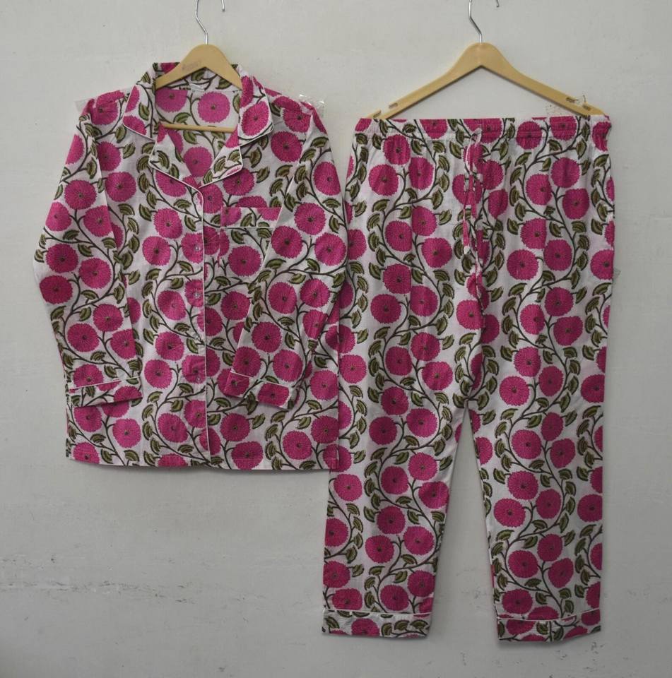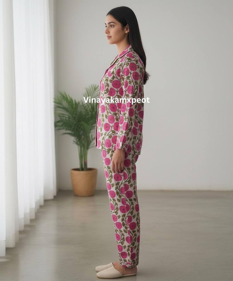 Ensemble de pyjama pour femmes en coton imprimé à la main de qualité supérieure, élégant, rose, à fleurs, pour l'été, séchage rapide, respirant, longueur intégrale