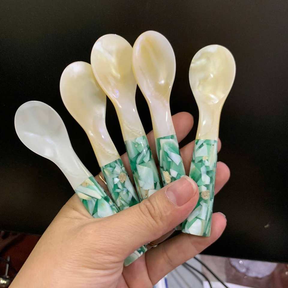 Cuillère à coquille artisanale de qualité supérieure en nacre irisée durable pour les cadeaux de luxe et le dessert.
