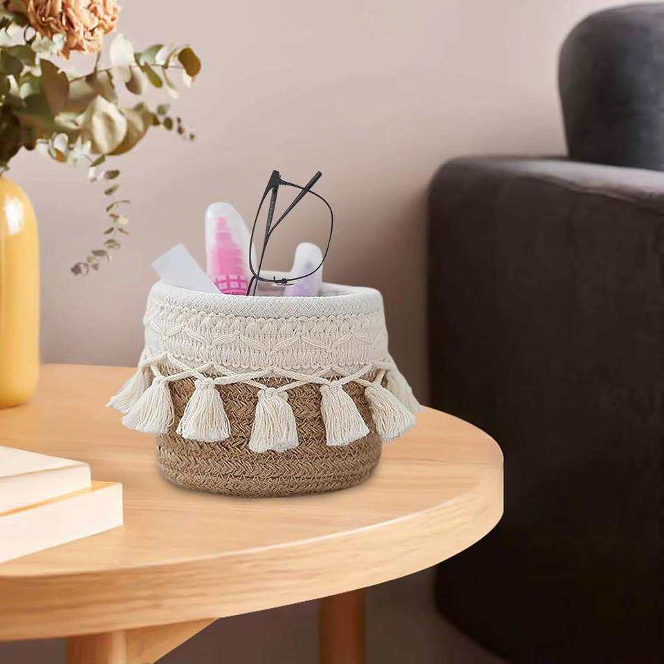 Panier en macramé fait main de qualité supérieure, en corde de coton tressée, petit bac de rangement avec franges pour la chambre d'enfant, la chambre à coucher, le bureau, les articles divers, la décoration