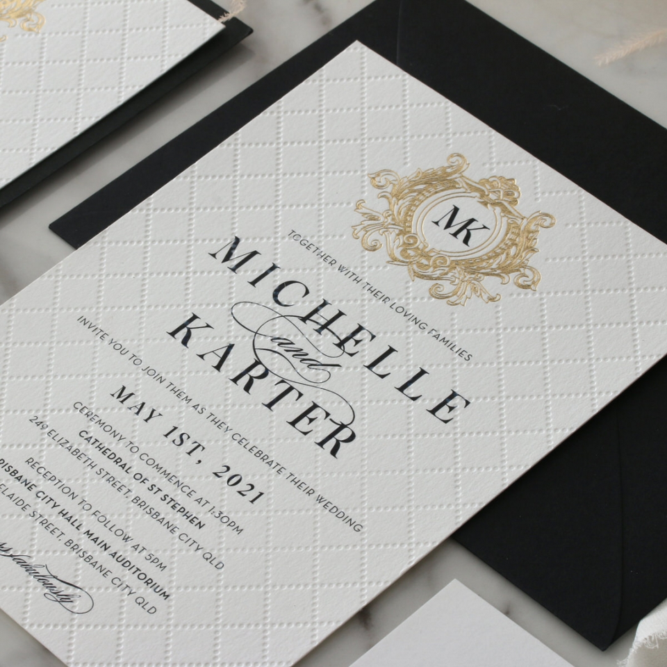 Papier texturé ivoire de qualité supérieure Crête matelassée pré-déjouée Feuille de luxe estampillée Annonce d'invitation de mariage
