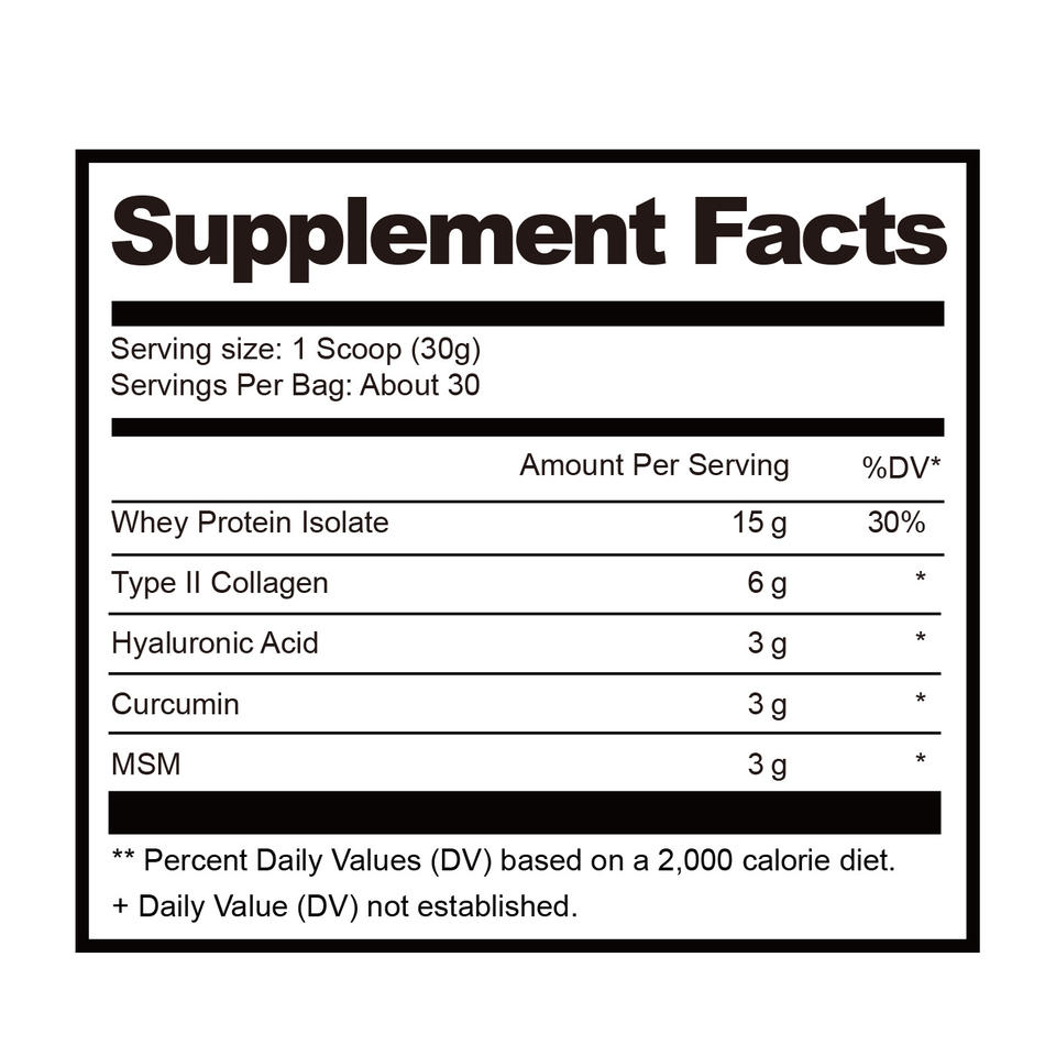 Ingrédient principal:Isolat de protéine de lactosérum, Collagène de type II, Acide hyaluronique, Curcumine