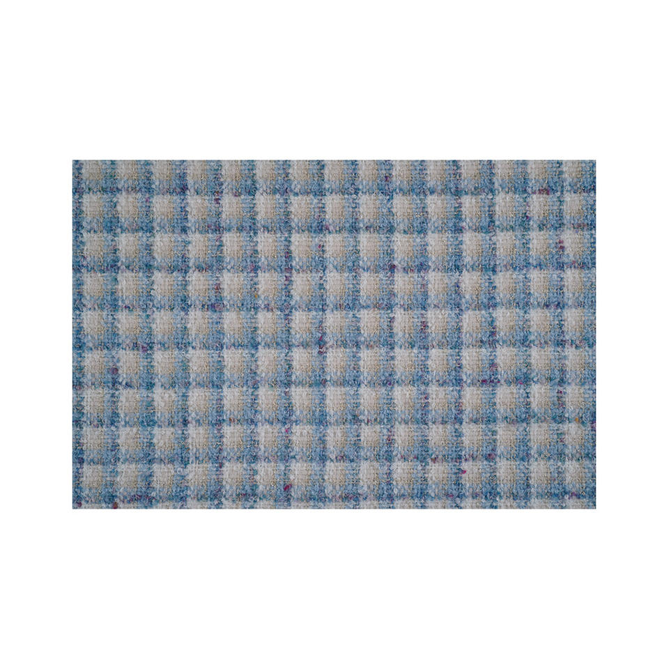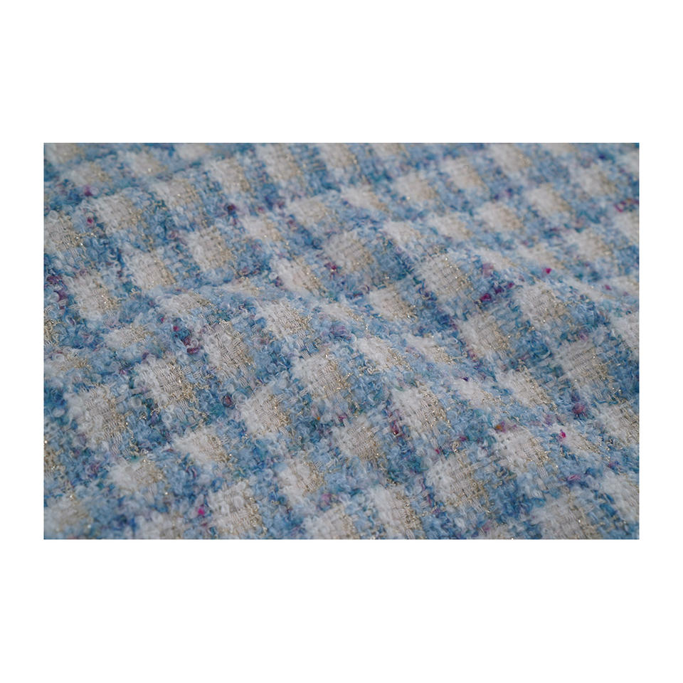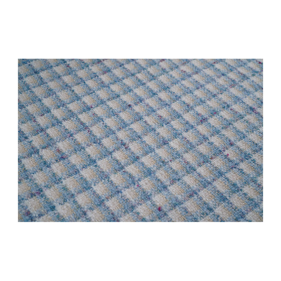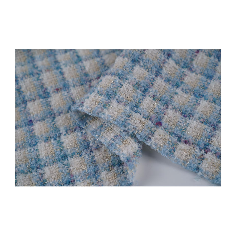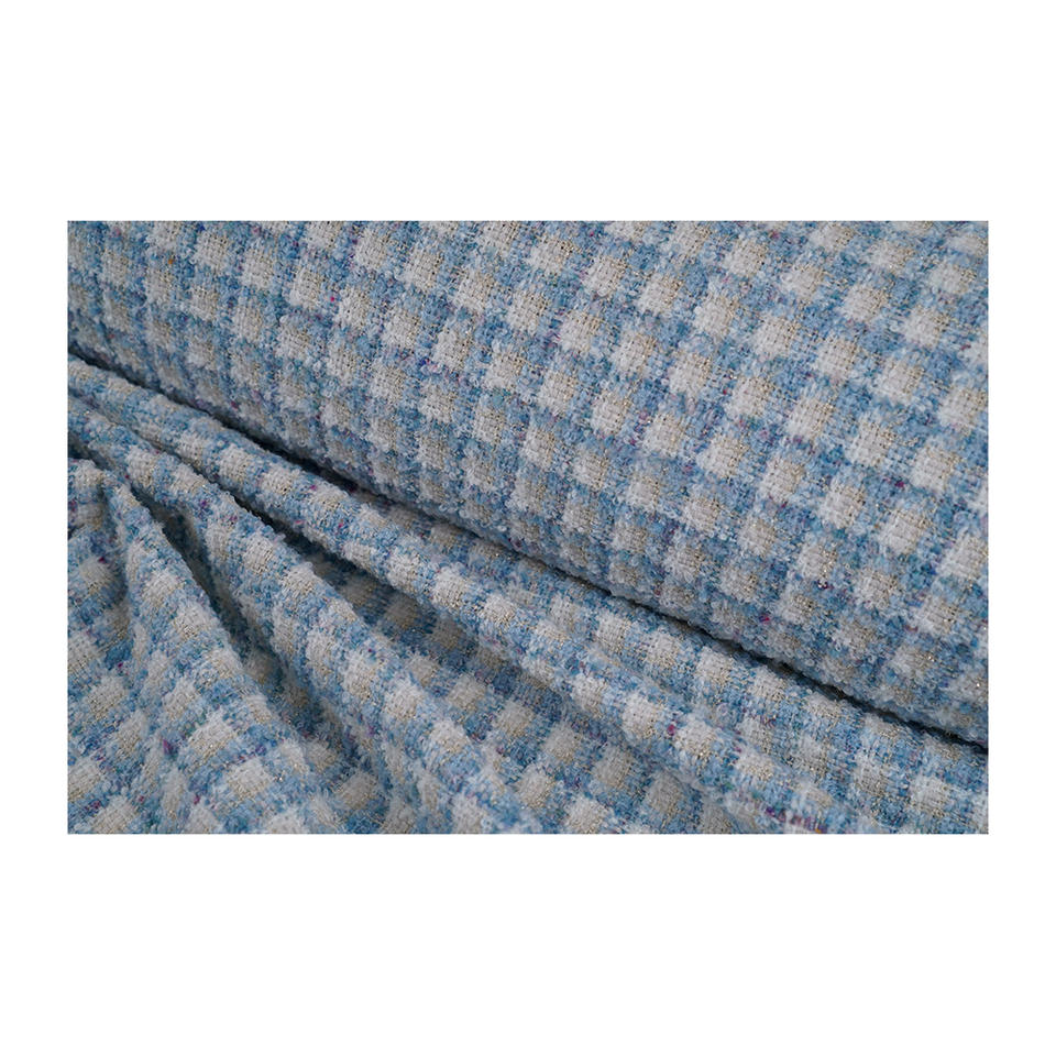Tissu en tweed fantaisie de qualité supérieure fabriqué en Corée, motif bouclé à carreaux ivoire et bleu ciel, tissu textile tissé sur mesure OEM & ODM