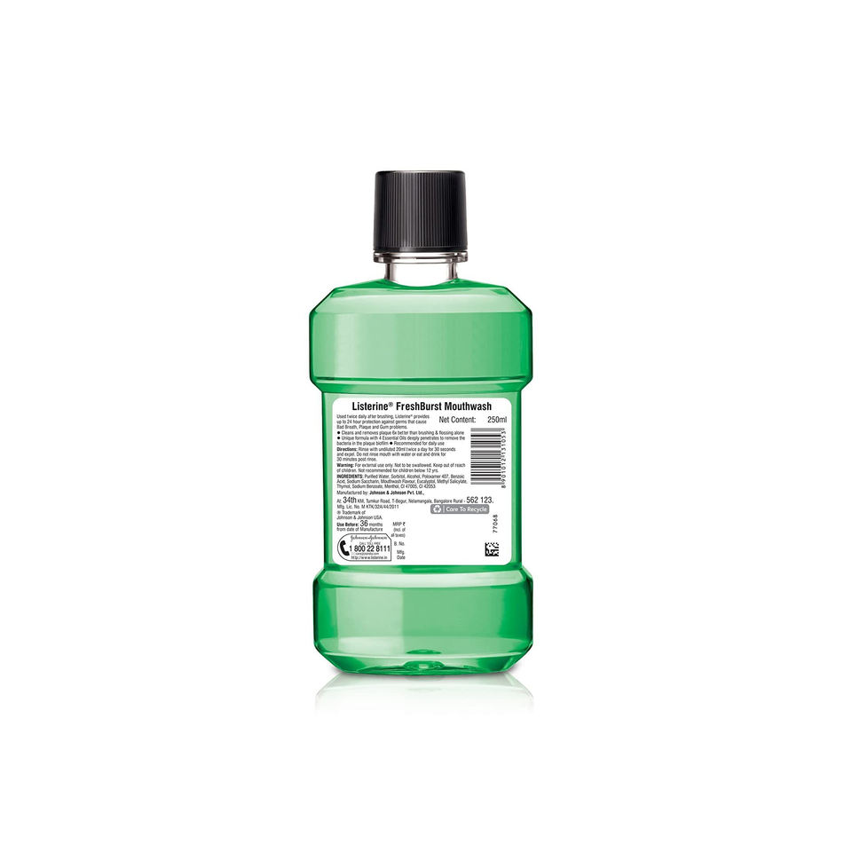 Premium 250 ml Freshburst formula with broad spectrum germ kill and plaque control
