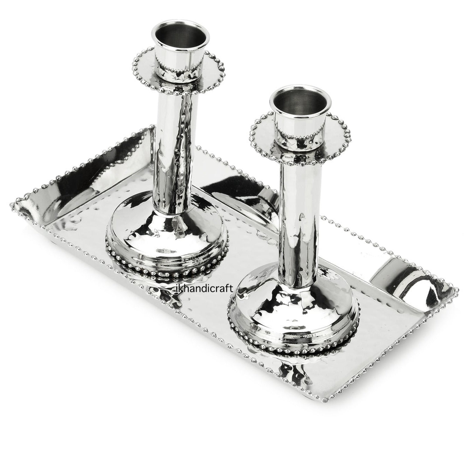 Plateau de conception perlé de feuille martelée de luxe de qualité supérieure accessoire décoratif pour la maison support à deux chandeliers finition nickel pour noël