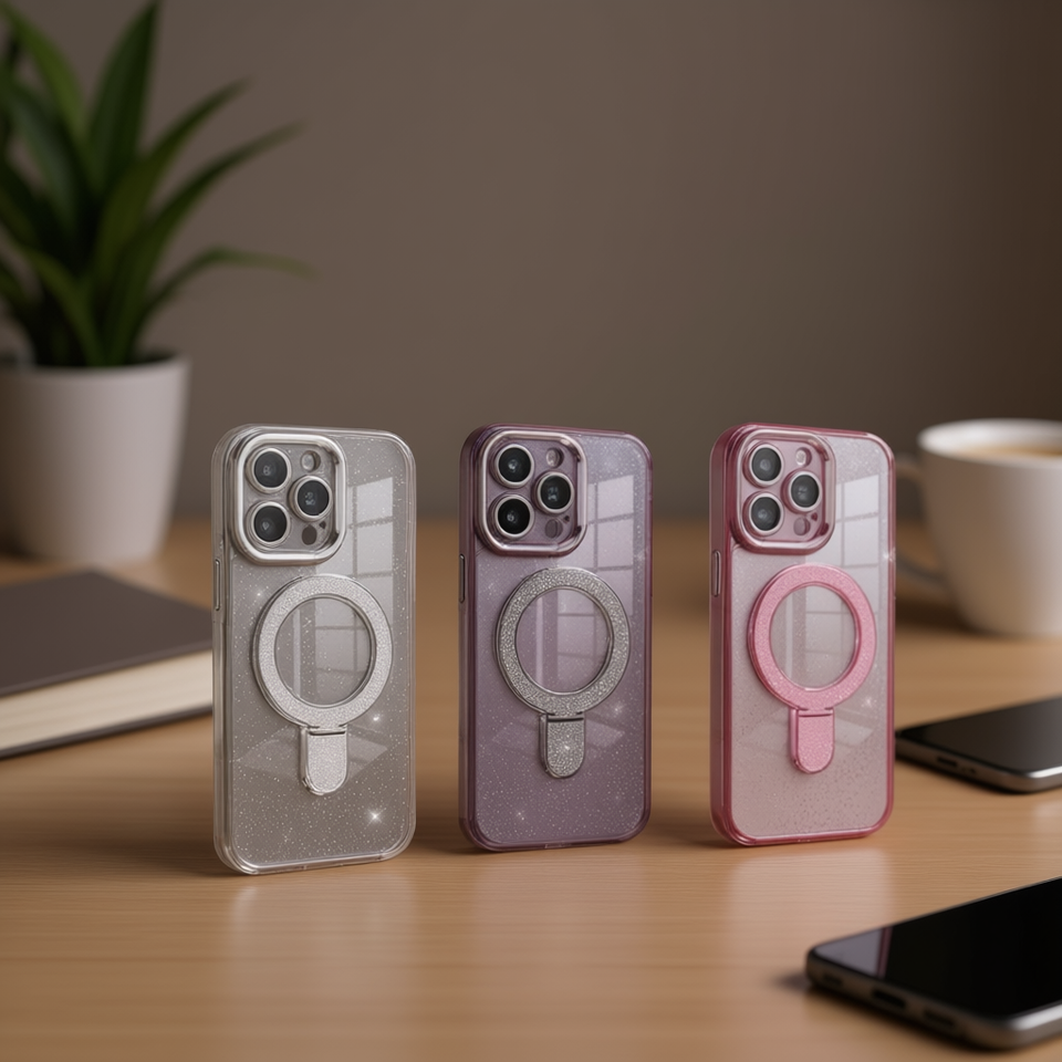 Étui transparent magnétique premium en TPU+PC avec design étoile, paillettes, support et poignée pour 17 Pro