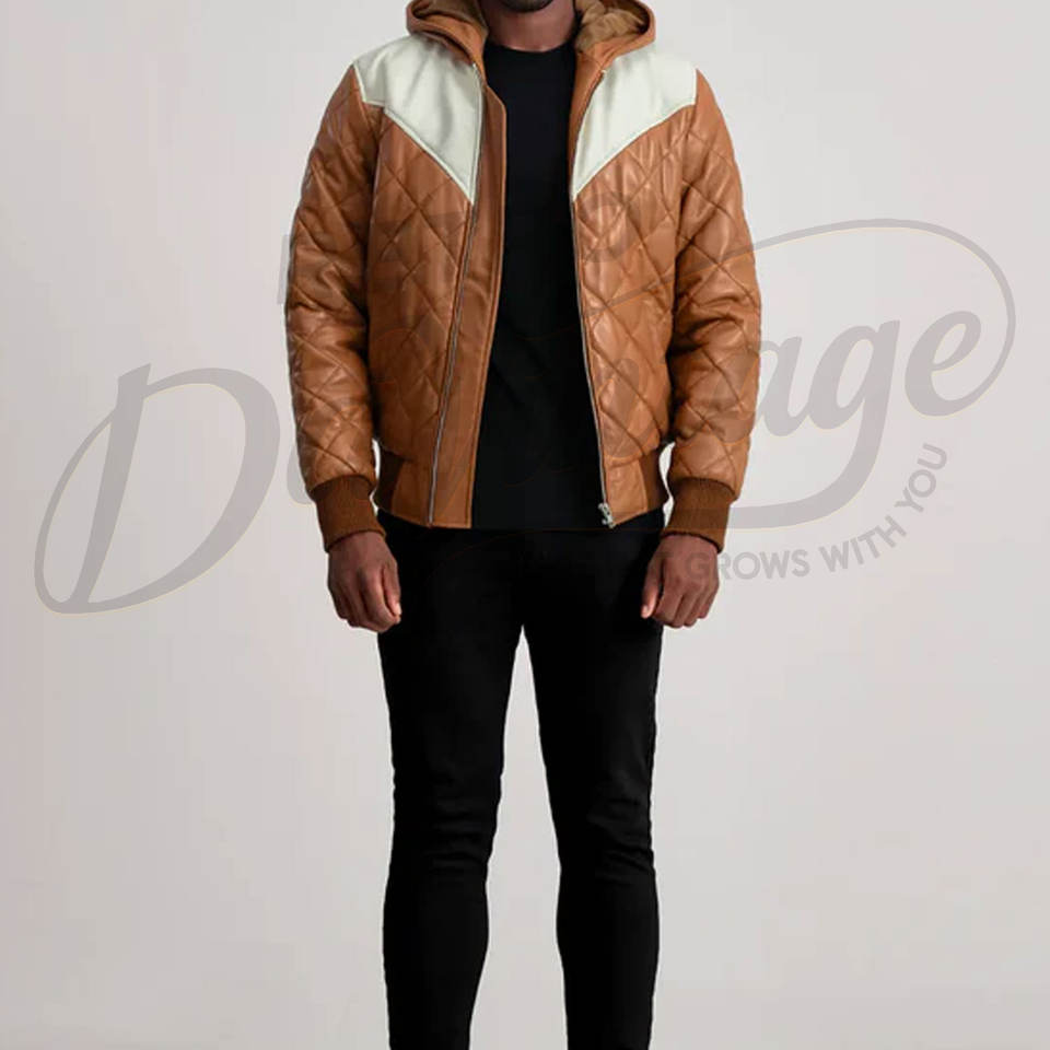 Blouson matelassé en cuir bicolore premium pour homme, design matelassé losanges, avec capuche, en similicuir, chaud et rembourré, pour l'hiver, avec épaulettes