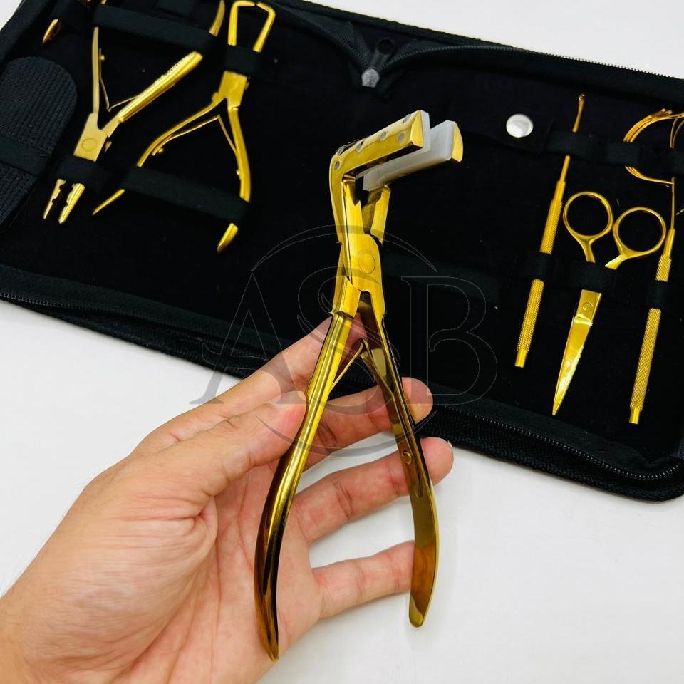 Kit d'outils de pose d'extensions capillaires Microlink Premium avec étui doré personnalisé – Pince à extensions capillaires en acier inoxydable avec Velcro