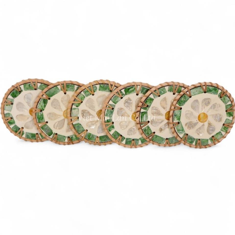 Premium Mother of Pearl Drink Coaster Designed with Woven Rattan Edge for Dining Table Styling and Daily Beverage Use
