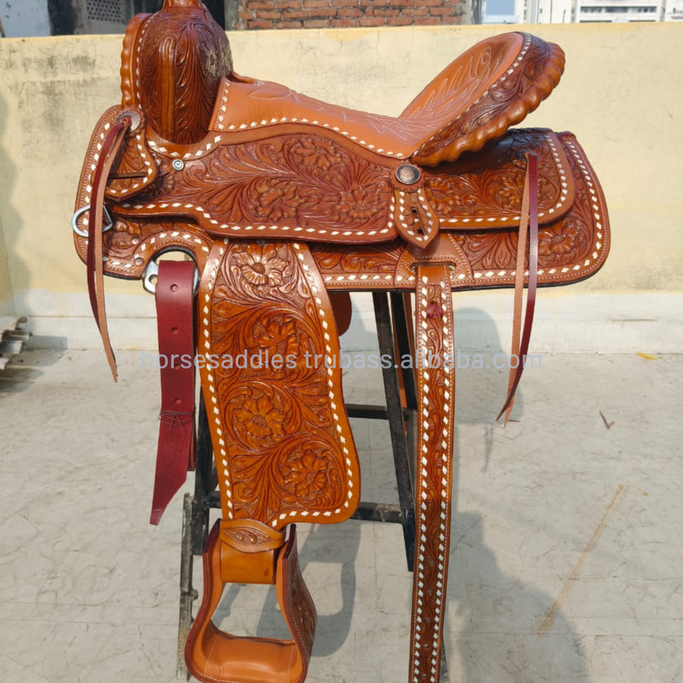 Selle de course de baril pour chevaux, nouveau style premium | Cuir entièrement sculpté à la main avec motifs floraux | Équitation professionnelle haute performance