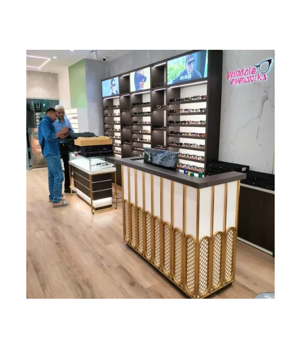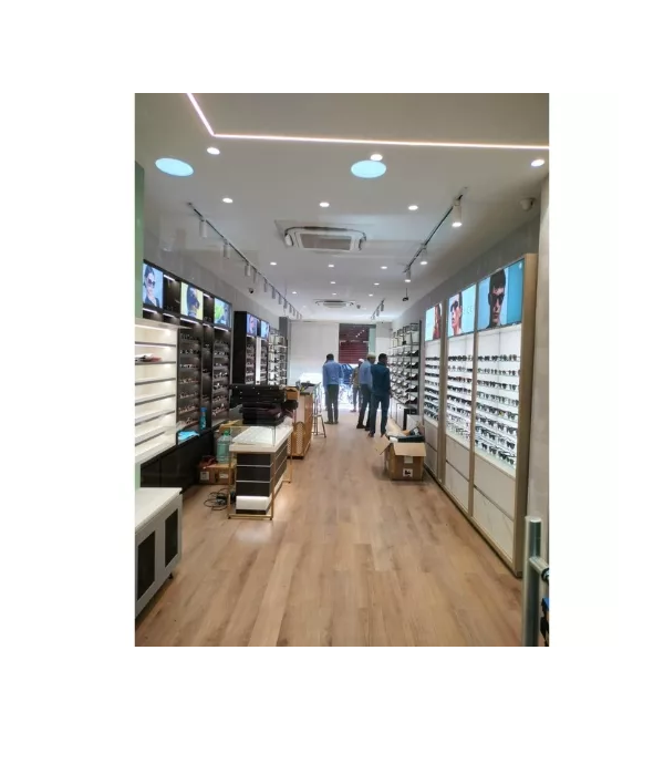 Décoration intérieure de salle d'exposition optique haut de gamme, design moderne, présentoir élégant pour lunettes, meuble mural pour l'affichage des lunettes