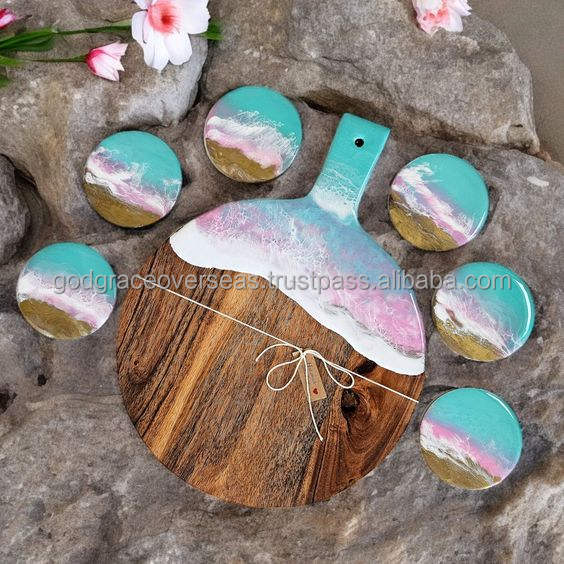 Premium Organic Natural Acacia Wood Cheese Board Set Delicate Blue Ocean Resin Pattern Eco-friendly for Chopping Sale