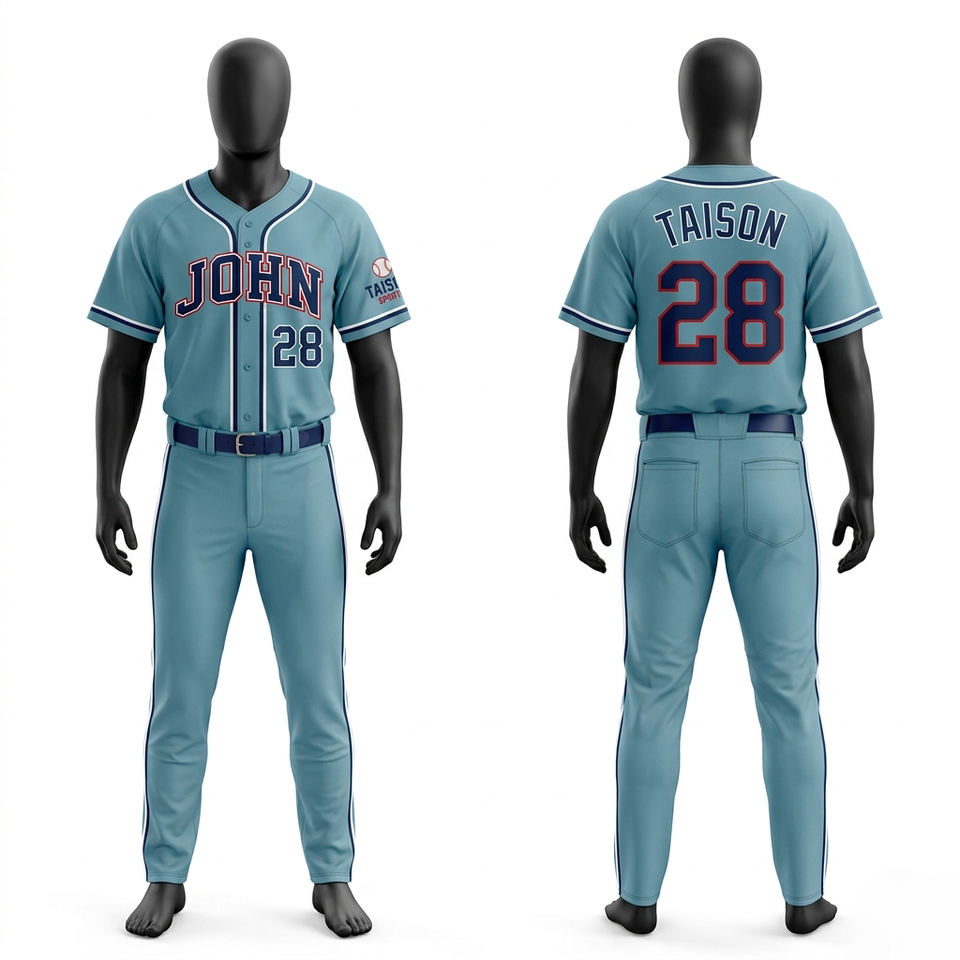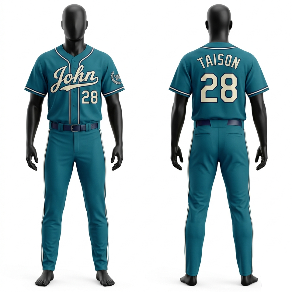 Uniforme de baseball en polyester interlock de qualité supérieure, 200 GSM, design de panneau contrastant bleu sarcelle, broderie personnalisée, logo en twill.